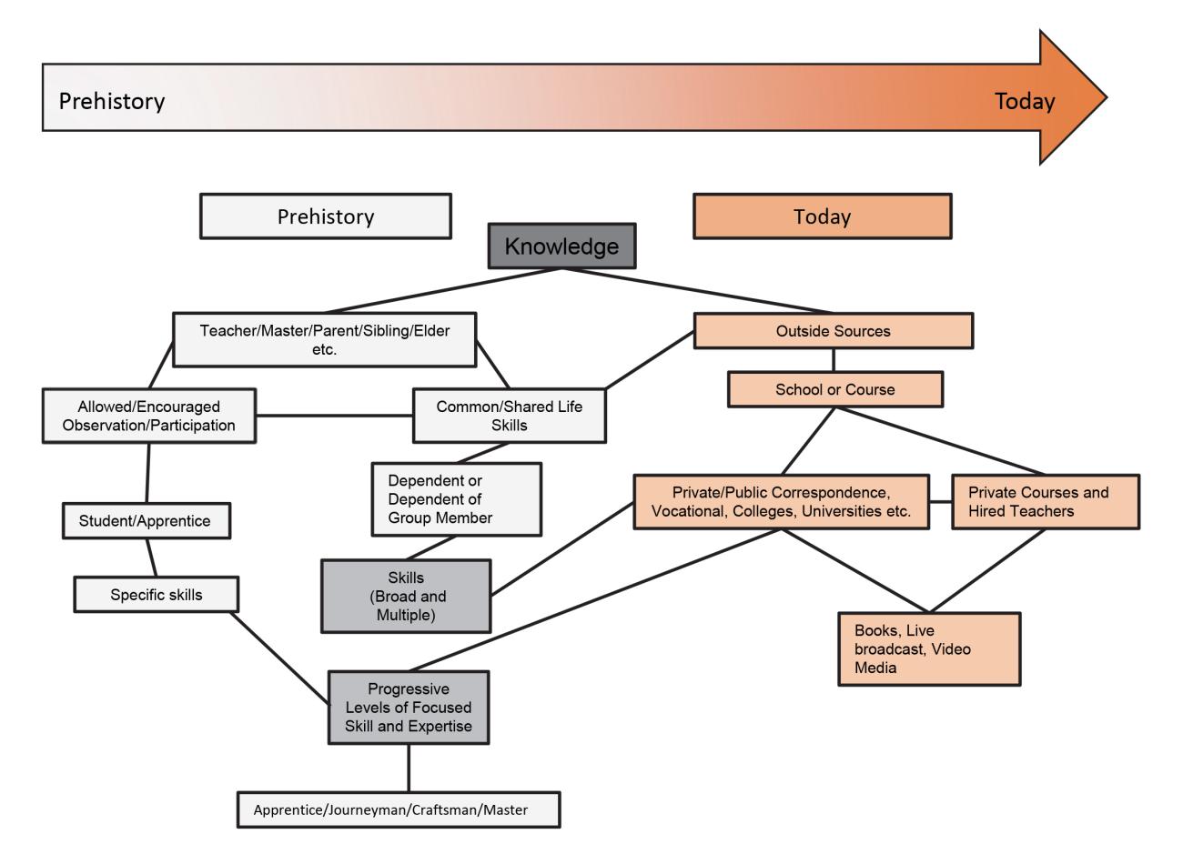 Foundational knowledge pathways for this craft have also expanded; DVDs, internet videos, books, and short-term courses with personal instruction or via internet streaming (See Graph 1). One can even purchase flint knapping courses online, engage in video-media based correspondence courses, and access instruction via live video lessons from individual instructors and institutes online. Many of these pathways were unavailable until relatively recently. Each of the aforementioned methods involve the employment of visual and verbal communication except for books. Books are great references after foundational knowledge has been acquired, even more so when accompanied by generous visual representations, but can cause interpretational issues especially if used in foundational skill acquisition. Descriptive prose provided by early explorers and ethnographers often serve as the starting point for investigations into prehistoric technologies.