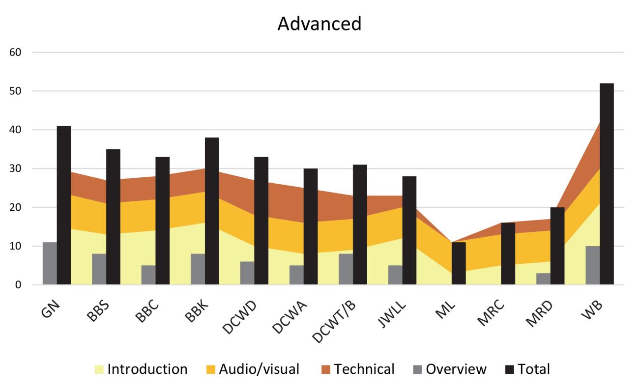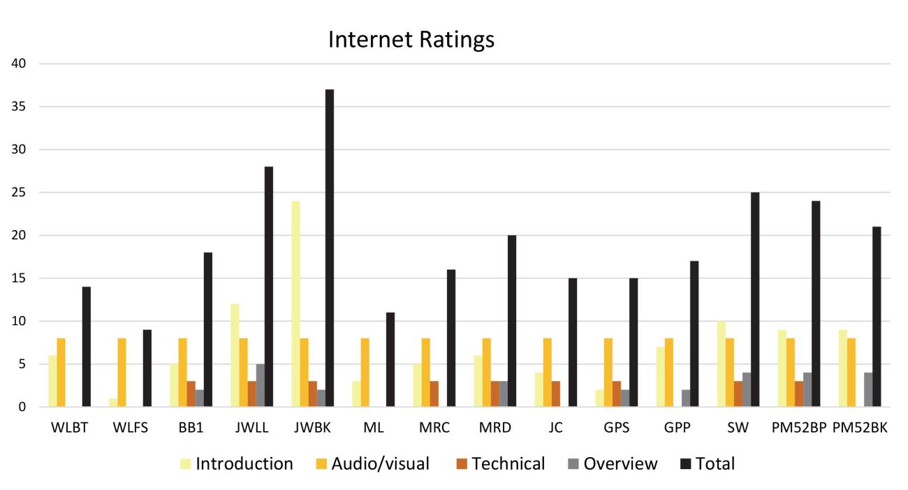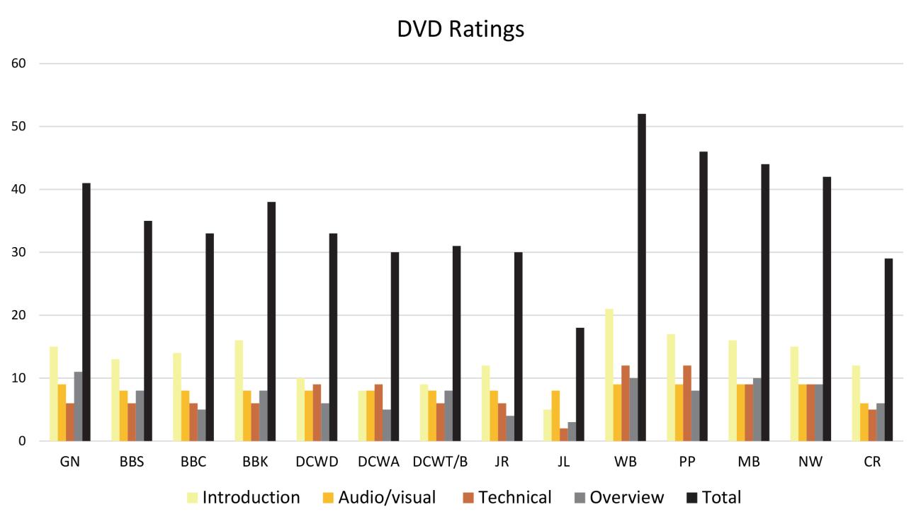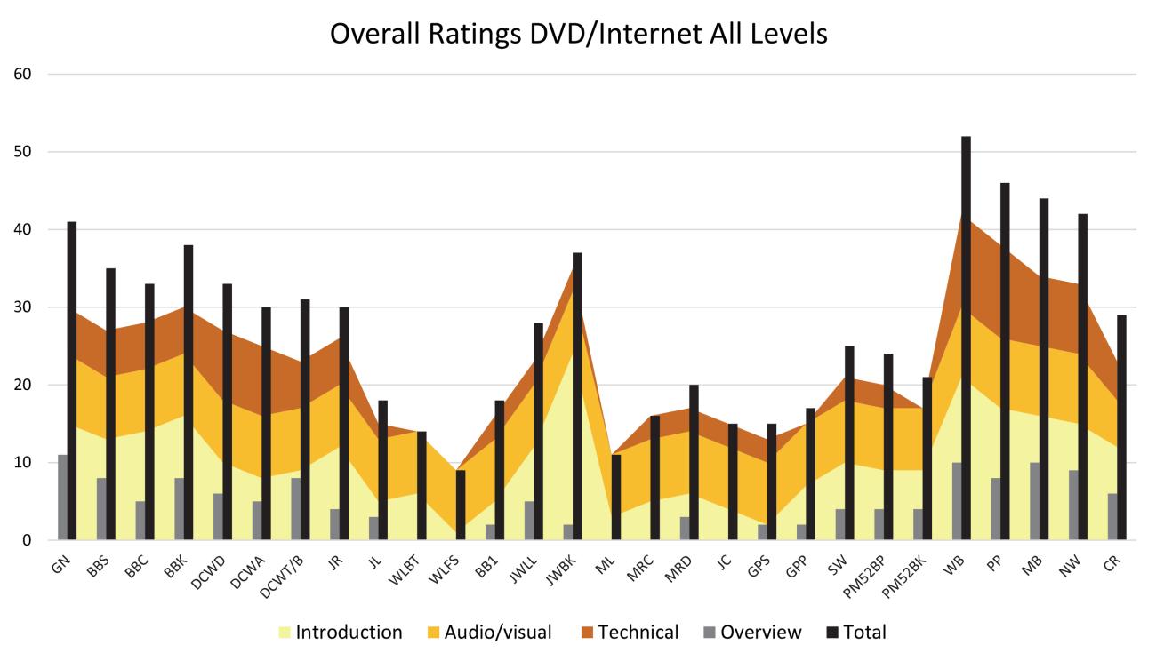 Looking ahead at Graph 7, the DVDs were separated from the internet sources. The highest score was 52, the lowest was 18 points with an average score of 35 points. Is the seemingly high average due to the proclivity of those producing commercial DVDs consistently used professional recording equipment, multiple angles, set lighting, scripted information and multiple and or alternate takes, editing etc., whereas most individual posters of online streaming videos primarily conduct their recording utilizing their cellular phones, or hobbyist level recording equipment, record the entirety of their segment in a single take situated in their normal work area with natural lighting, and with little to no preparation or scripting? Most of the same options afforded the commercially produced videos, to a degree, are available to those posting their own recordings online but the majority appear to choose not to. In several instances this detracted from the information provided.