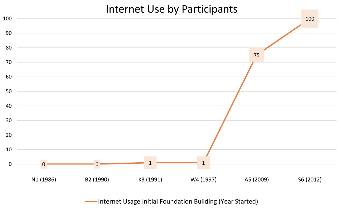 In examining their answers, their dedication and continual personal commitment in learning this craft becomes very apparent. All but two of the crafters/artists began knapping before 1991 (See Graph 3). This is important to note as the accepted “birth date” of the World Wide Web and the internet as we know it was 6 August of that same year (Bryant, 2011). Two of the participants primarily utilized visual media with the internet as their biggest, and/or first influence and teacher for their foundational development. They are both currently under 25 years of age (See Graph 4). The remaining four began their craft in the period from 1979 to 1997. Although they have all accessed videos, it was much later and not during their foundational development in the craft (See Graph 5). All of the flint-workers questioned started their craft independently, to an extent or another, until a mentor was found shortly afterward.