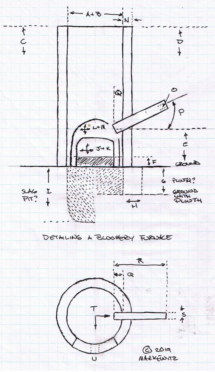 The following elements are illustrated, based around what the author defines as a simple âshort shaftâ furnace, intended for slag tapping, and finally bottom extraction of the bloom. The drawing includes variables that also relate to alternate builds / methods (plinth, slagpit, âblow holeâ).