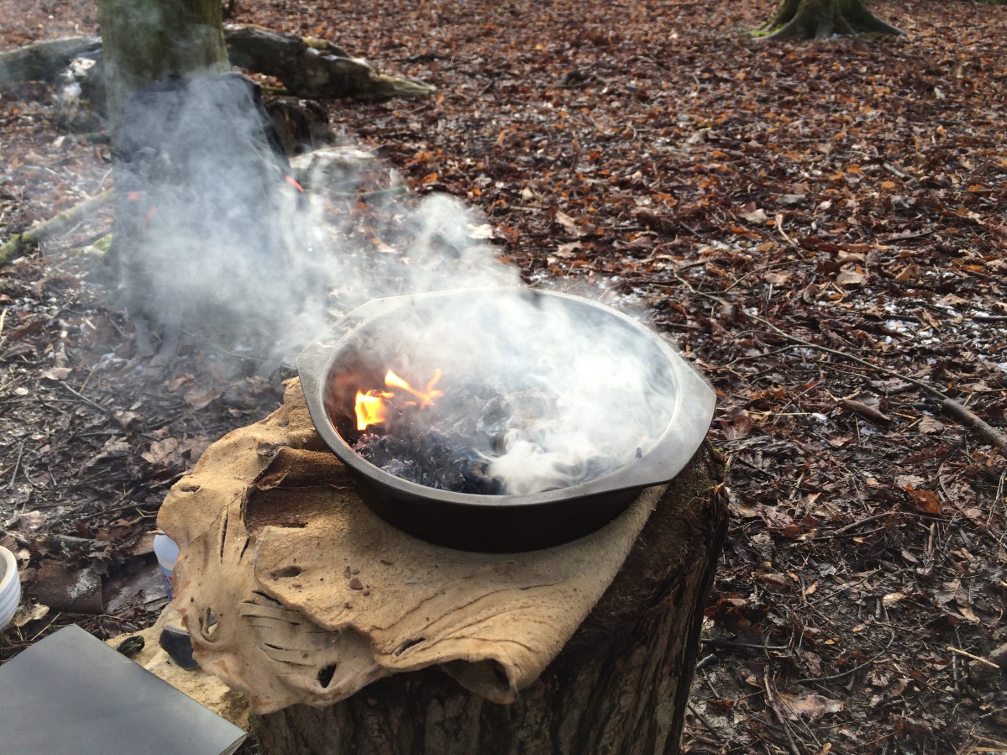 The results of the experiment failed to validate the model put forward by Hayes et al (2016). While the actual experiments do not in themselves disprove the use of MnO2 as a fire lighting aide, they do raise questions about the exact specifications of its use. Birch is an excellent firelighter, due to the concentrations of triterpenoids within the bark, so it was surprising to see that it failed to catch a spark when combined with MnO2, despite it lighting by itself in the same scenario. This indicates that there may be a critical threshold for the efficacy of MnO2 within an amount of tinder, above which it hinders the reception of a spark. This may simply be due to the competition for surface area. The use of the ferrocerium rod also rules out the use of colder pyrite sparks as the mechanism of ignition. In contrast the reignition of the birch tinder in the second experiment does support the theory that heated MnO2 generates additional oxygen which might slowly collect in pockets within the tinder, allowing for a cooler temperature of pyrolysis to rapidly increase and reignite. The smoke produced from the final round of birch tinder is an interesting phenomenal addition to any interpretation of MnO2 use with fire, since it suggests that adding it may change the quality and colour of the smoke. This could be done deliberately in order to create a special or unusual effect, perhaps as part of a wider toolkit of artwork and body modification.
