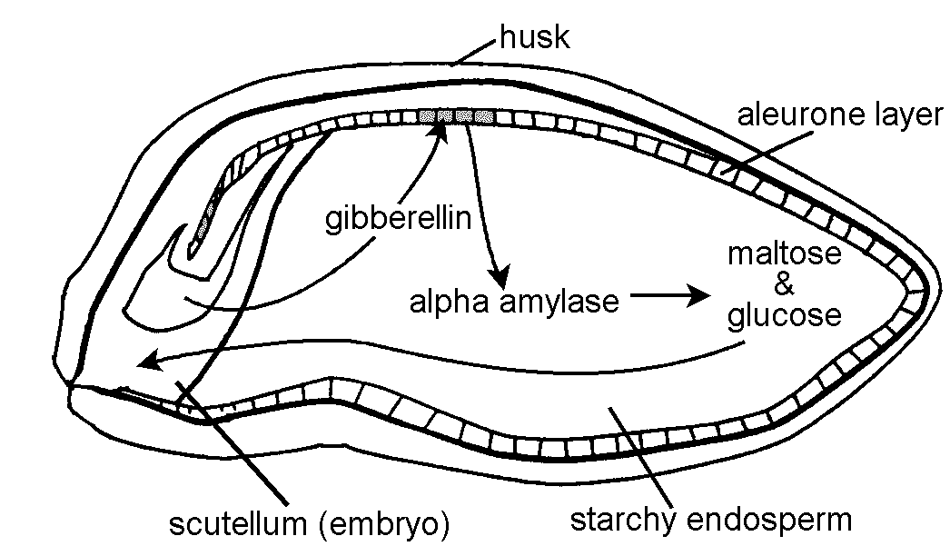 Figures 16 and 17 are diagrams taken from from Bewley and Black (1994) and they are helpful for understanding the biochemical and physiological processes of cereal grain germination.. When grain is sufficiently wet and oxygenated, after steeping and aeration, the embryo releases a growth hormone, gibberellin. Beneath the husk is a layer of cells known as the aleurone layer. Gibberellic acid activates the aleurone layer cells to release several enzymes, including alpha and beta amylase. This begins the conversion of grain starch into maltose and glucose, the food source of the growing grain. Modification is the term used by maltsters today for this process.