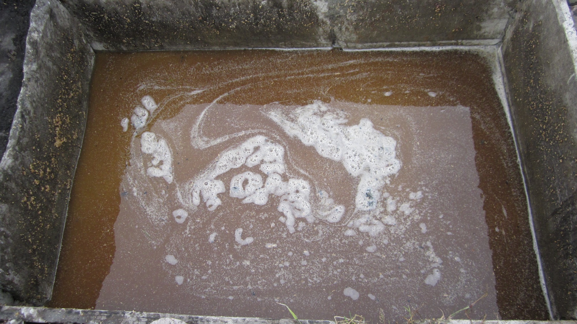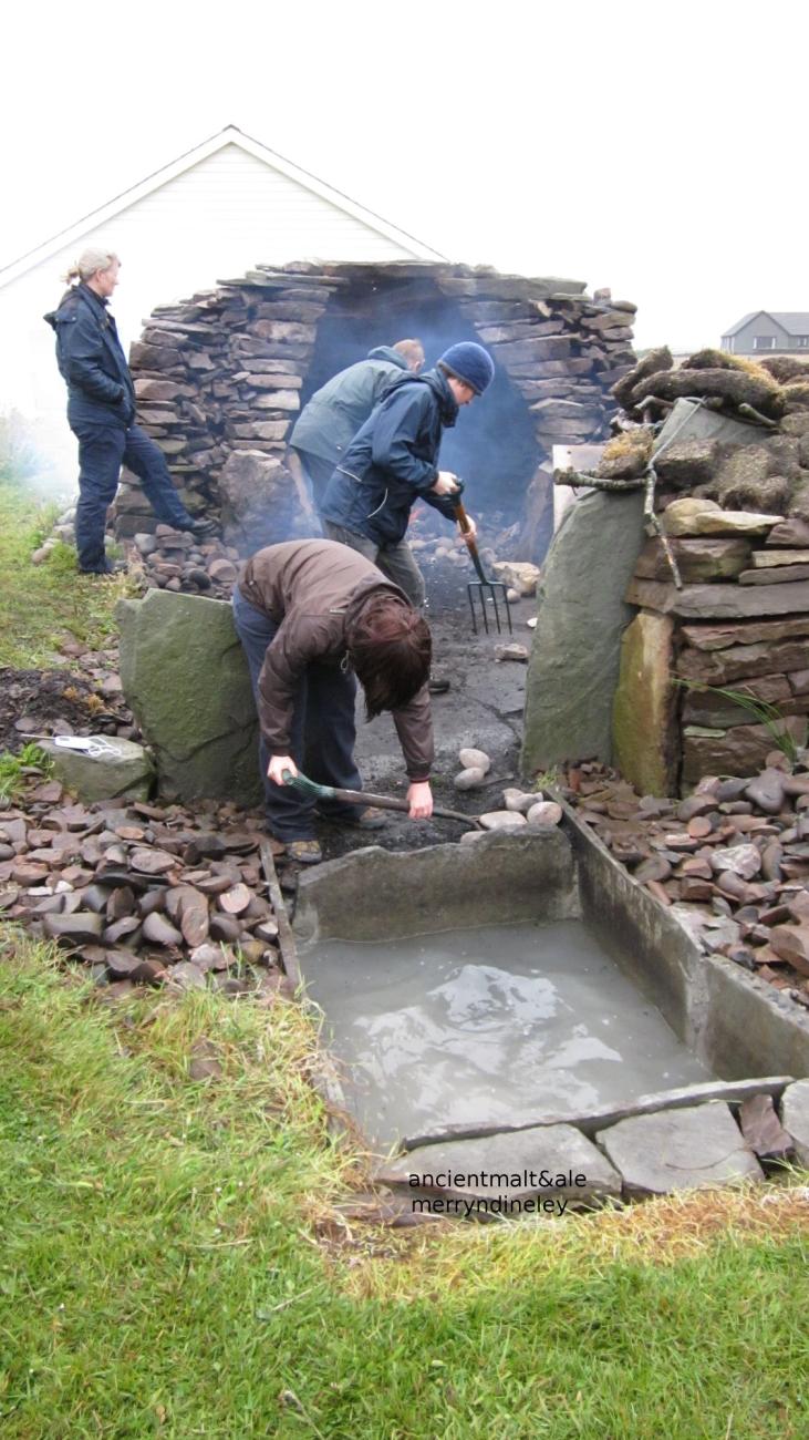 In the summer of 2010 Graham and I were invited to the island of Bressay, Shetland, to work with Dr Lauren Doughton. For her doctorate she was investigating burnt mounds and troughs, looking into potential uses. These included dyeing wool, bathing, and brewing beer (Doughton, 2014). On a cold blustery June day we filled the replica stone trough with 200 litres of water. The trough was between one third and a half full. It was roughly 18 inches (45 cm) deep, 2 feet 4 inches (70 cm) wide and about 4 feet (1.25 metres) long. We heated rocks and rolled them down the slope using garden forks (See Figure 25). When the water was hot enough we added 50 kilos of crushed malted barley (See Figure 26). We found that it was easy to heat the water to around 75°C, a perfect temperature for the strike, the brewers term for adding the crushed malt to the hot water. This process reduces the temperature to the desired 65-67°C for 'mashing in'. The crushed malt was left in the hot water for about an hour by which time the saccharification was complete (See Figure 27). It was an ideal mash tun.