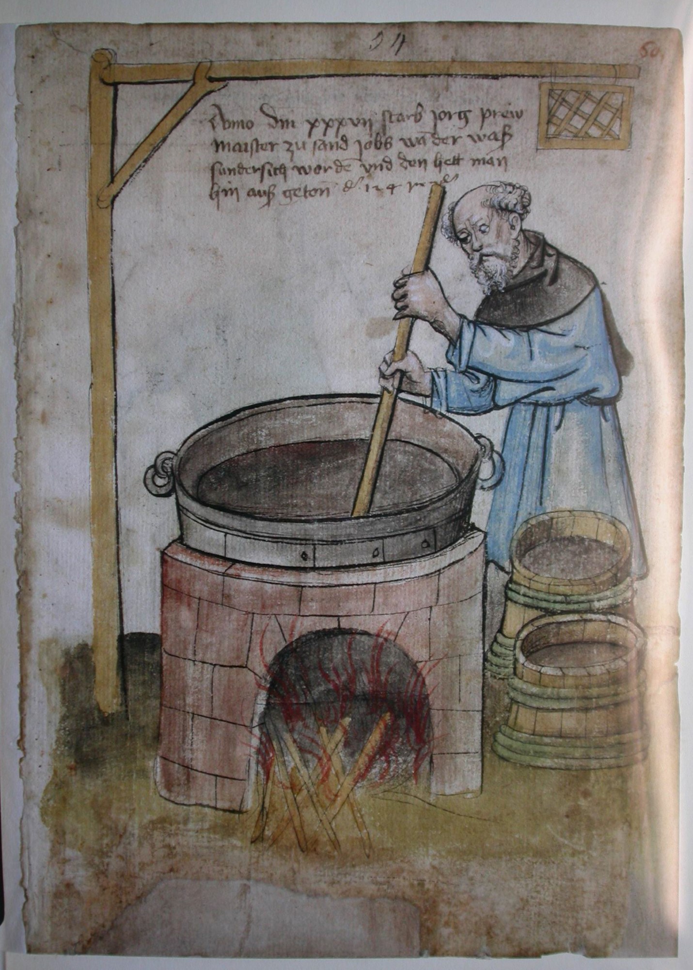 The design of the Eindhoven team’s mash oven is traditional. It is built with bricks. There are several illustrations of this kind of mash oven and metal mash tun in the House Book of Mendel, an early 15th century document (Trum, 2002). Commissioned by a wealthy family, this book contains many illustrations of crafts of the time. The image of Herttel Pyrprew is the oldest known picture of a named brewer (See Figure 34). In this image he might be ‘mashing in’ or maybe he is adding the hops to the wort and boiling the hopped wort. It’s not clear from the illustration.