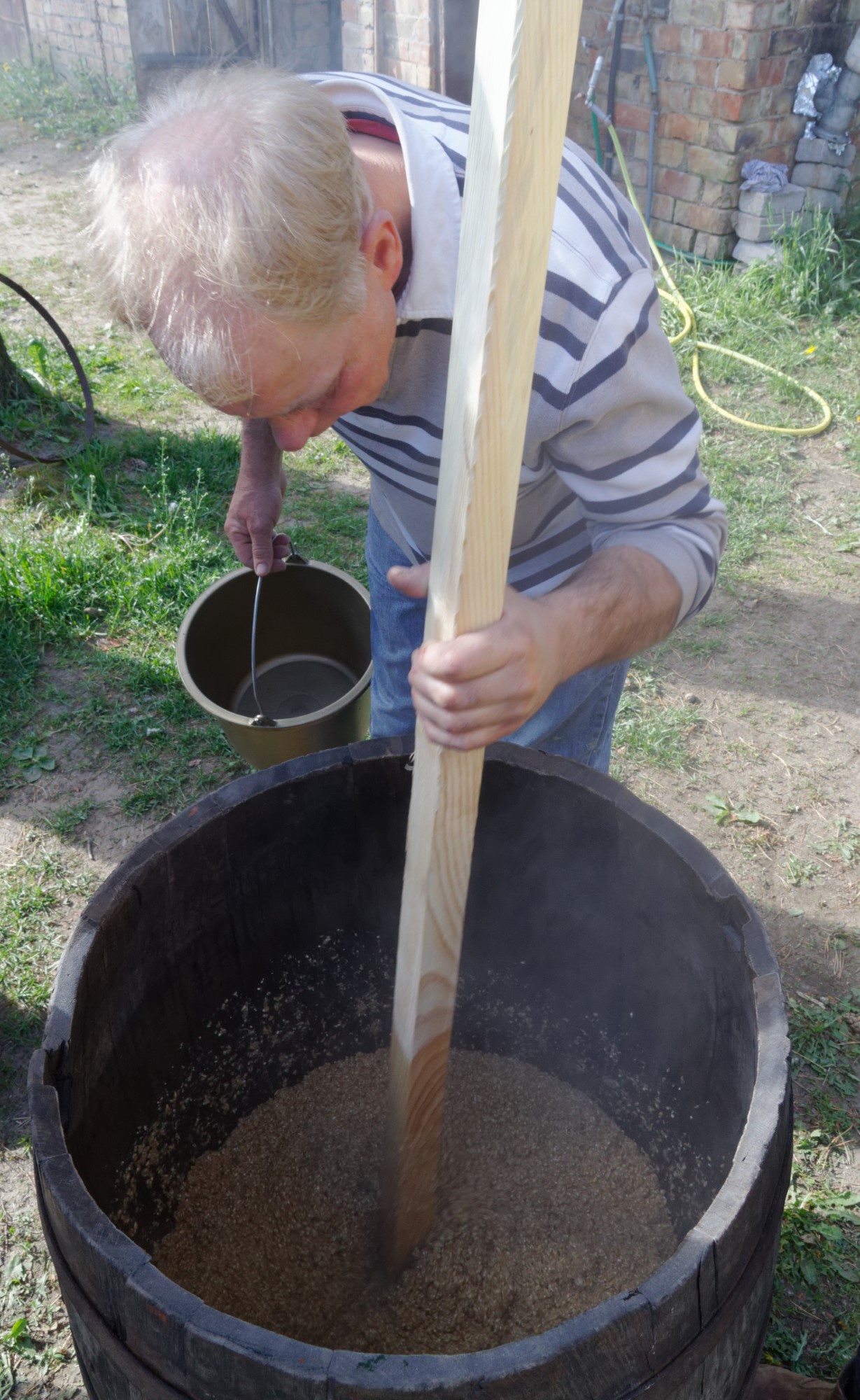 The process of ‘mashing in’ is done in a vessel called a mash tun. This is where the crushed malt and hot water are mixed together at about 65 – 67°C. The mixture is left for about an hour or an hour and a half, keeping a constant temperature throughout, to allow the conversion of grain starch into malt sugars by enzymes in the germinated grain. In some parts of Lithuania, Estonia, and Russia the completed mash is then baked in an oven to condition it (see figures 39, 40, 41). The high temperatures cause the sugars, amino acids and proteins to combine to create rich flavours, a process called the Maillard reaction. It is perhaps similar to ancient Egyptian or Sumerian techniques of making ‘beer bread’ in an oven. Keptinis could be a rare survival of this ancientmashing technique and might explain the wide variety of ancient Egyptian beers.