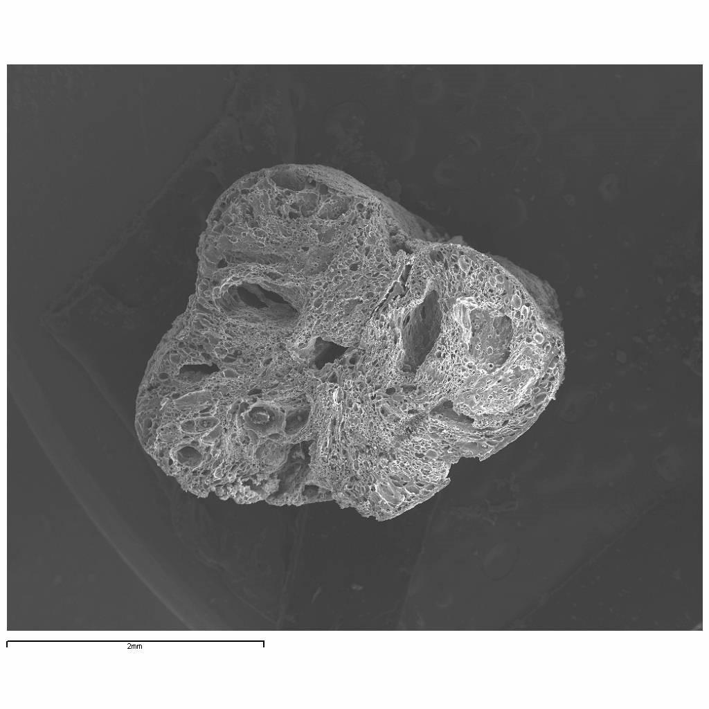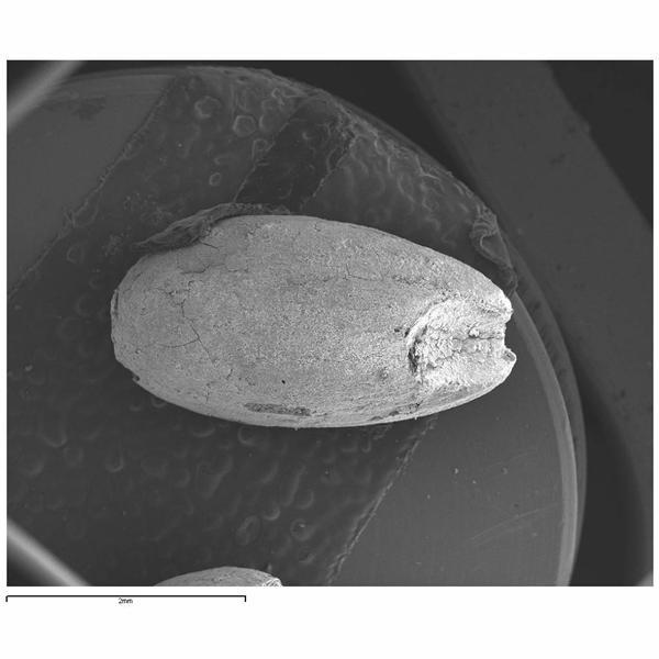 The embryo is missing (See Figure 18). The tiny grain was cut in half (See Figure 19). I am not sure what I expected to see, having been told that the structure of ancient carbonised grains would not be well preserved. A close up image of the aleurone layer was made (See Figure 20). I was surprised to see that individual aleurone layer cells had survived and were visible. It is possible to identify malting in ancient carbonised grains by looking at the morphological changes in the aleurone layer cells. This has been done recently (Heiss et al., 2020).