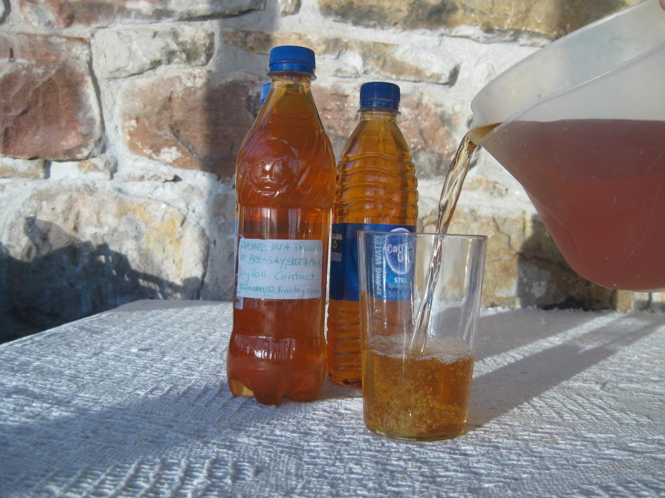 We collected the sweet dark brown wort using jugs, transferring it into a plastic fermenting vessel and added some commercial yeast. A handful of dried meadowsweet flowers were added later, after the fermentation was complete. We made a fine tasting golden coloured Bronze Age style ale (See Figure 28). It was one of the best ancient ales that we have ever made.