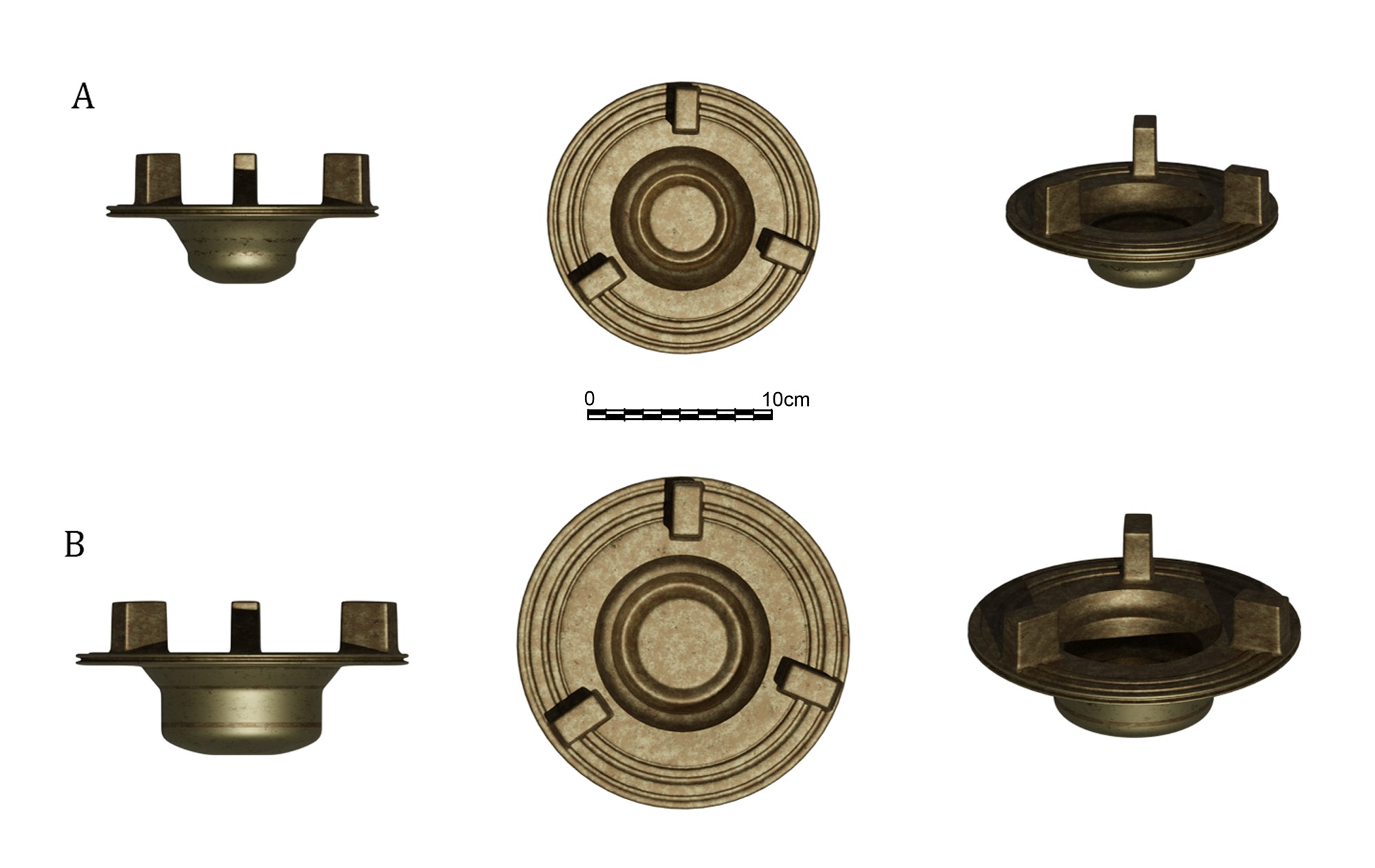 Due to its morphology, the fragment found at Gallineras would belong to the second of these typological groups, closely resembling the socketed slab found at the Cabeço Redondo site in Moura (with a depression surrounding the rotation area, showing friction scuff marks, which would possibly help to secure and stabilise the metal pivot). Considering that the Gallineras potter's wheel must have originally had a metal piece as a pivot, it was also recreated, taking as a model one of the bronze items found in the Albacete area (whose section had greater similarities with the pivot socket of the Gallineras base). Initially, we made a 3D model of the Albacete piece and adapted it to the diameter and profile of the hollow of the Gallineras stone base (See Figure 12).