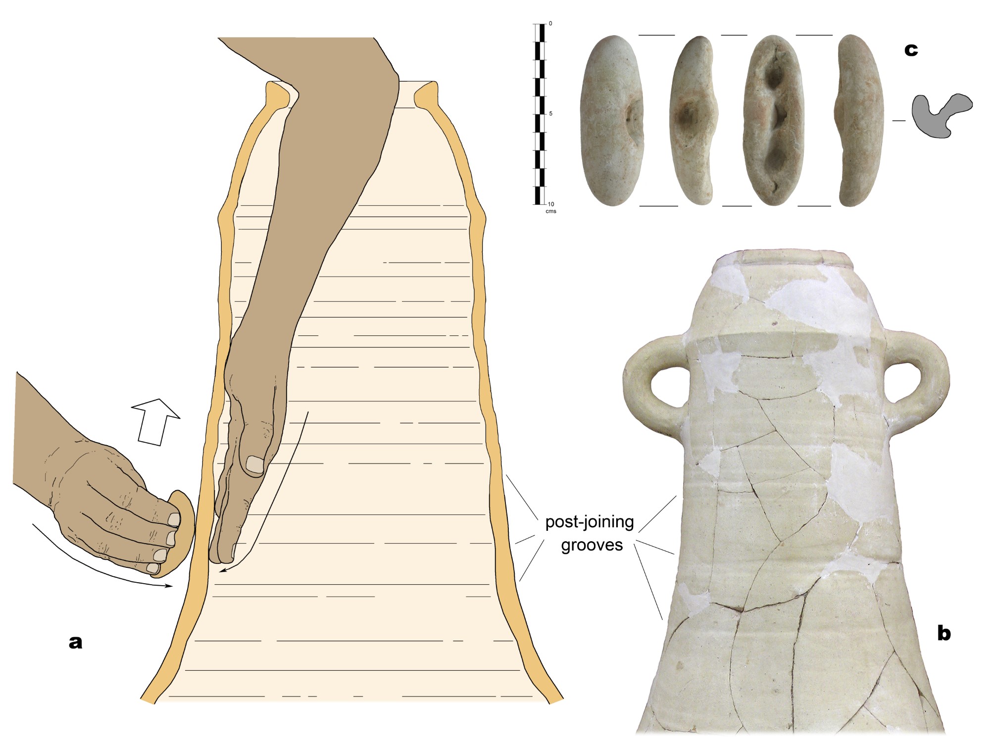 The next stage would likely be immediate, placing the upper part over the central section, completing the entire body of the container (See Figure 10.6). To perform this step, depending on the height of the potter and the position of the wheel with respect to the floor, a bench or auxiliary support may have been needed to introduce the arm through the mouth of the amphora. In any case, as in the previous operation, with the aid of an assistant turning the wheel, the two pieces would have been joined (perhaps glued together with barbotine, adjusting the diameters of both and therefore with lateral or lateral-vertical connection), applying considerable pressure over the joining area and shaping the upper part of the amphora, thus fixing the maximum length of the container. The attachment would have been carried out using the hands, possibly with only the help of the fingers, or perhaps using tools on the outside to produce a more homogenous surface (See Figure 16a). Even so, in most amphorae examined up to date, this bonding area is easily identifiable as striated areas or turning grooves of varying thickness are often grouped along it (See Figure 16b), and in some cases there are also slight differences in the direction of the walls. The use of ceramic smoothing blades and other tools (also ceramic dies, polished stones, etc.) is well attested at workshops such as Torre Alta in contexts that date back to the 3rd and 2nd centuries BC, where several examples of tools of this type have been found (See Figure 16c). It is possible that these same basic utensils, whether made of pottery, wood, or bone, could have been used by the potters of the 5th century BC, although none of the excavated workshops have provided any information on this matter so far.