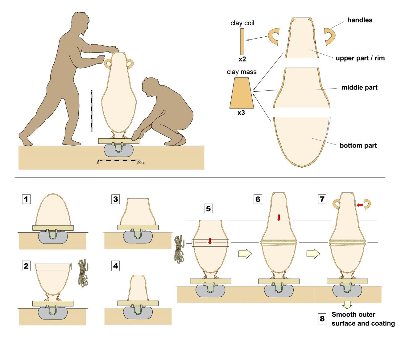 The manufacture of a T-11213 type container was (and still is today) a challenging process that demands a significant investment in raw materials (clay and water) and time, and requires great skill and know-how, given the volume of the parts to be produced and the series of steps to be completed. The average weight of an empty T-11213 varies in the range of 12-14 kg, while 1 litre of dry local clay (marls, previously sieved or decanted to achieve an optimum state for turning) weighs around 1450-1600 g. The shrinkage due to initial drying and during firing is estimated to be around 20-30%, so several litres (kilograms) of water were added to the mixture during kneading and turning. Therefore, for a fired amphora weighing about 13 kg (6-6.5 litres of clay), about 8.7-9 litres of dry processed clay and a minimum of 2.2-3 litres of water would have been used (excluding the final process of external coating, and the use of slip to glue the main parts). Access to fresh water in the area needed to be by means of wells (none from the 5th century BC has been identified so far), or brought from the city itself, more than 10 km away, or from rivers located on the continental shore (also quite a few kilometres away). It would therefore be a limited resource, so spending several litres per amphora must have been a carefully calculated investment.