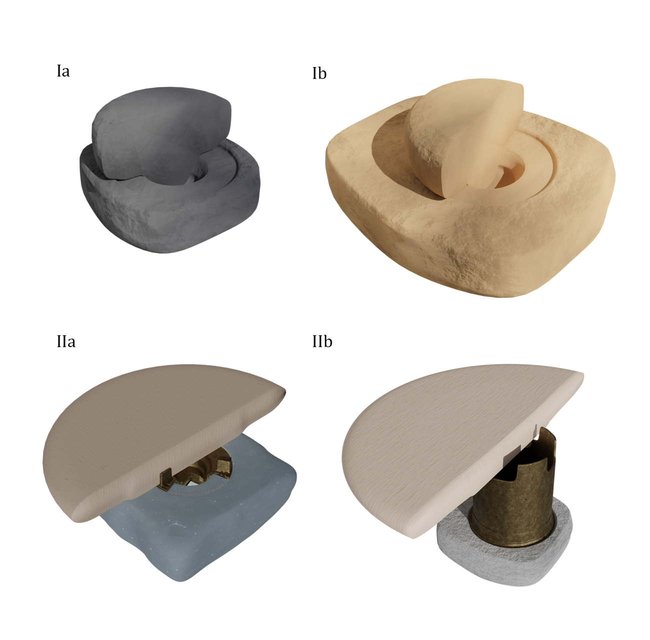 After developing the replica of the piece from Gallineras, the next step was to recreate the rest of the components that were part of the potter's wheel. In order to achieve this, we based our designs on the similarities observed with other potter's wheels documented in the Iberian Peninsula and the Levant, all of them classified within the two main typological groups already discussed, and on previous proposals for the recreation of the wheel heads (which both in the West and in the Levant used to be made of wood and therefore have not survived in the archaeological record). As described above, the first of the typological clusters includes potter's wheels that were formed by a stone "dormant" base that had a socket on which another stone pivot piece was fixed and rotated (Jiménez Ávila, 2013; Fernández Maroto, 2013). On the other hand, the second group of potter's wheels also included a stone base with a socket, but a metal piece was fitted to serve as a pivot for the wheel head, as was the case for the bronze items found in the province of Albacete (Meseguer and García, 1995), Las Cogotas (Cabré, 1930; Celestino, 1991, p.266, figure 3), Palomar de Oliete (Celestino, 1991, p.265, figure 2) or in Moura (Soares et al., 2013), and the much later ones documented at Baetulo (Serra Rafols, 1942).