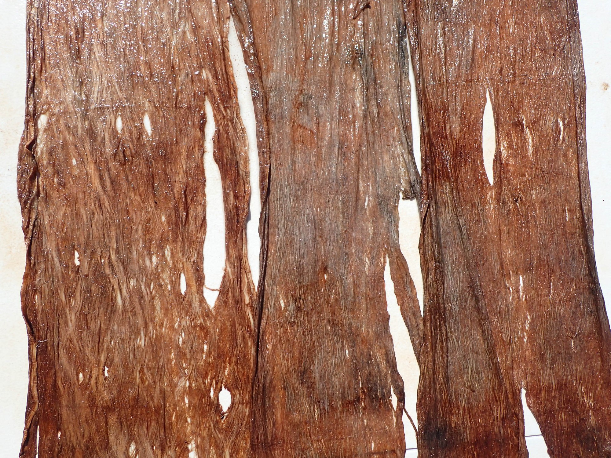 Kamakau cryptically says that the bast soaked “for a long time.” Uncertain as to just how long would be long enough, I decided to try eight days of submersion. Upon removal, I was pleasantly surprised at their appearance. Kamakau states that the bast turns dark after this procedure, and indeed, each moʻomoʻo had turned a dark coppery-brown (See Figure 7). After thoroughly rinsing and scraping them, they were ready to be beaten into a finished kapa.