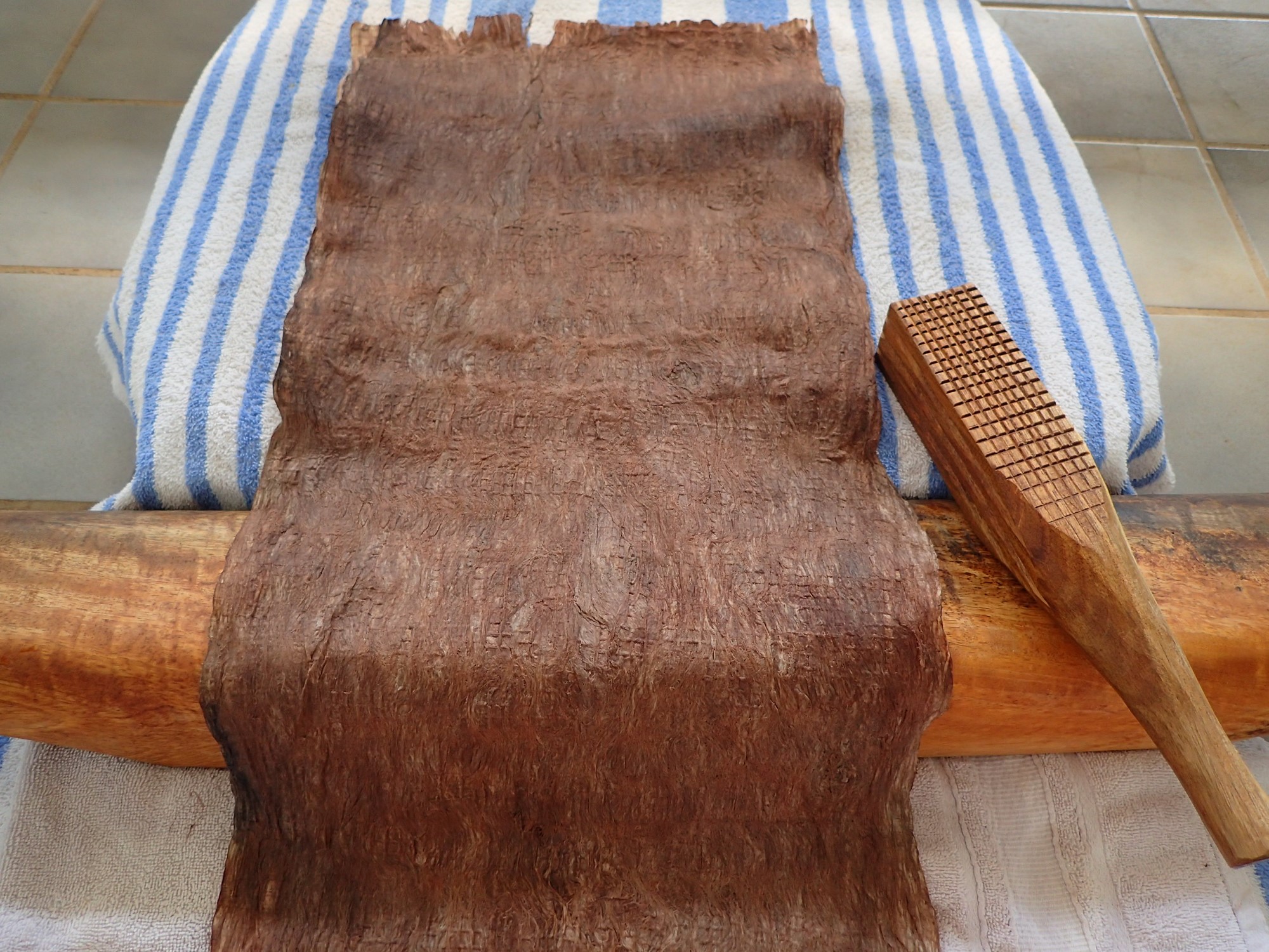 Kamakau does mention that to lengthen a kapa kaha, “one piece was united to the end of another by beating the sections together” (Kamakau, 1976, p.111). Given the small amount of bast I had on hand, I chose instead to simply beat one single example sheet, rather than making and connecting multiple kapa.
