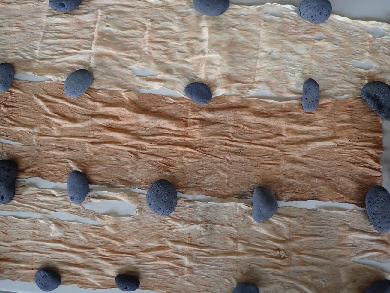 The first step of making a kapa kaha requires previously soaked wauke bast to be “daubed with hili” and allowed to dry (Kamakau, 1976, p.111). I was immediately struck by the fact that Kamakau does not mention the bast first being beaten into moʻomoʻo prior to dyeing. Modern-day kapa makers usually beat soaked bast prior to any dyeing activities. The act of beating the bast allows the fibers to spread, making them more receptive to colorant penetration. It is possible that Samuel Kamakau may have glossed over this initial step. Applying my knowledge to this situation, I chose to use moʻomoʻo (once-beaten bast, pre-kapa) for this stage.