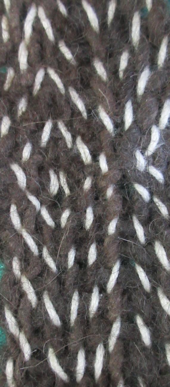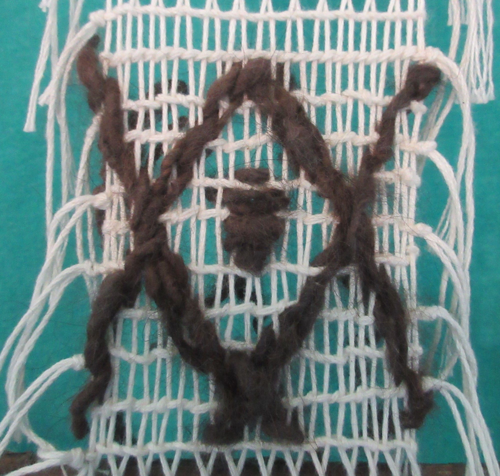For warp twining with a two-colour warp of alternating colours, the 26 warp threads were tied to the top bar of the loom in the same configuration as for the previous experiments, but with the warp threads alternating with one warp thread of the hand-spun black-brown fur yarn and one warp thread of the natural cotton yarn. For each two-colour pair of warp threads, the natural colour warp was tied in the proper right hole of a lunate weight, and the black-brown warp was tied in the proper left hole of the lunate weight; the initial weft thread was tied to the top loom bar. Then the warp was stabilized, and the width was regulated by creating several rows of plain warp twining at the top of the textile.