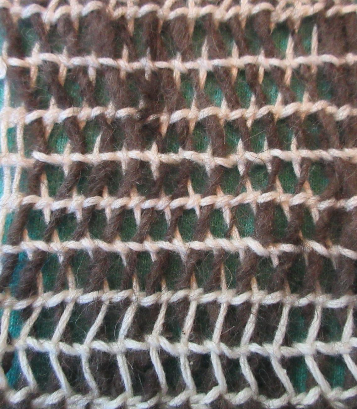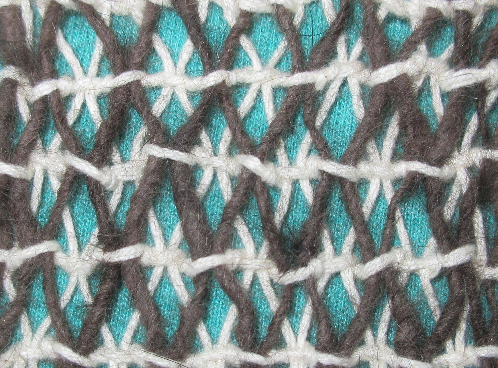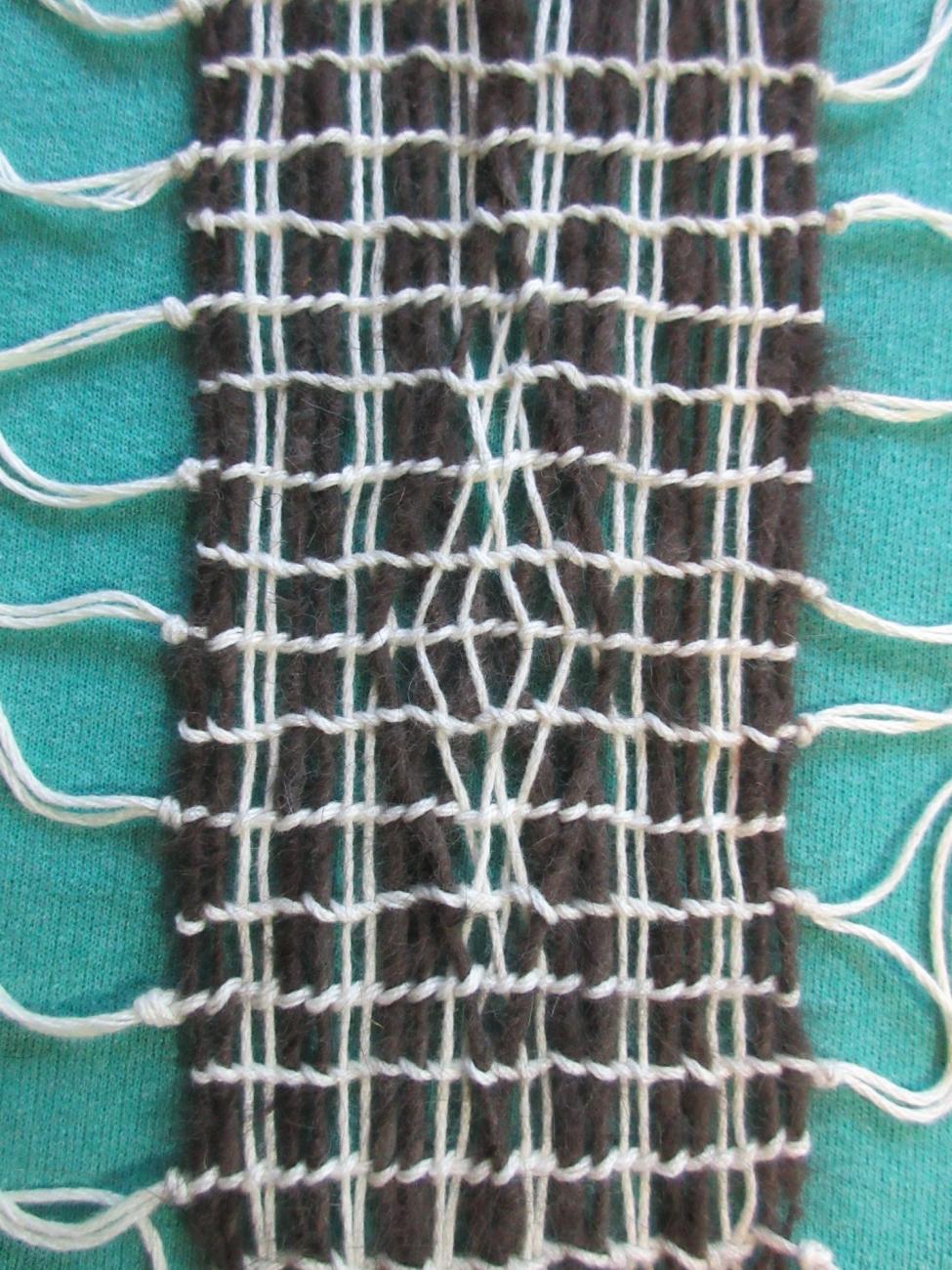 The second structure in this experiment is two-colour, double-faced crossed-warp weft twining. This type of twining involves displacing each two-colour pair of warp threads into crossed warps (X-shapes) by turning the crescent weights one half-turn in the same direction and then weft-twining the warps in place. By crossing each successive pair of warp threads in the same direction for three rows, this displaces each of the warps successively along oblique paths, creating diagonal lines of colour, with one diagonal line of colour on the front and one on the back of the textile--but the openwork design of the textile allows both colours and patterns to be seen from one side (See Figure 16). Then the process may be reversed by turning the crescent weights one half-turn in the opposite direction for the next three rows, and this creates a zigzag or herringbone pattern. This twining structure is greatly facilitated by the crescent weights, which organize and hold the warp threads in place during the weft-twining process.
