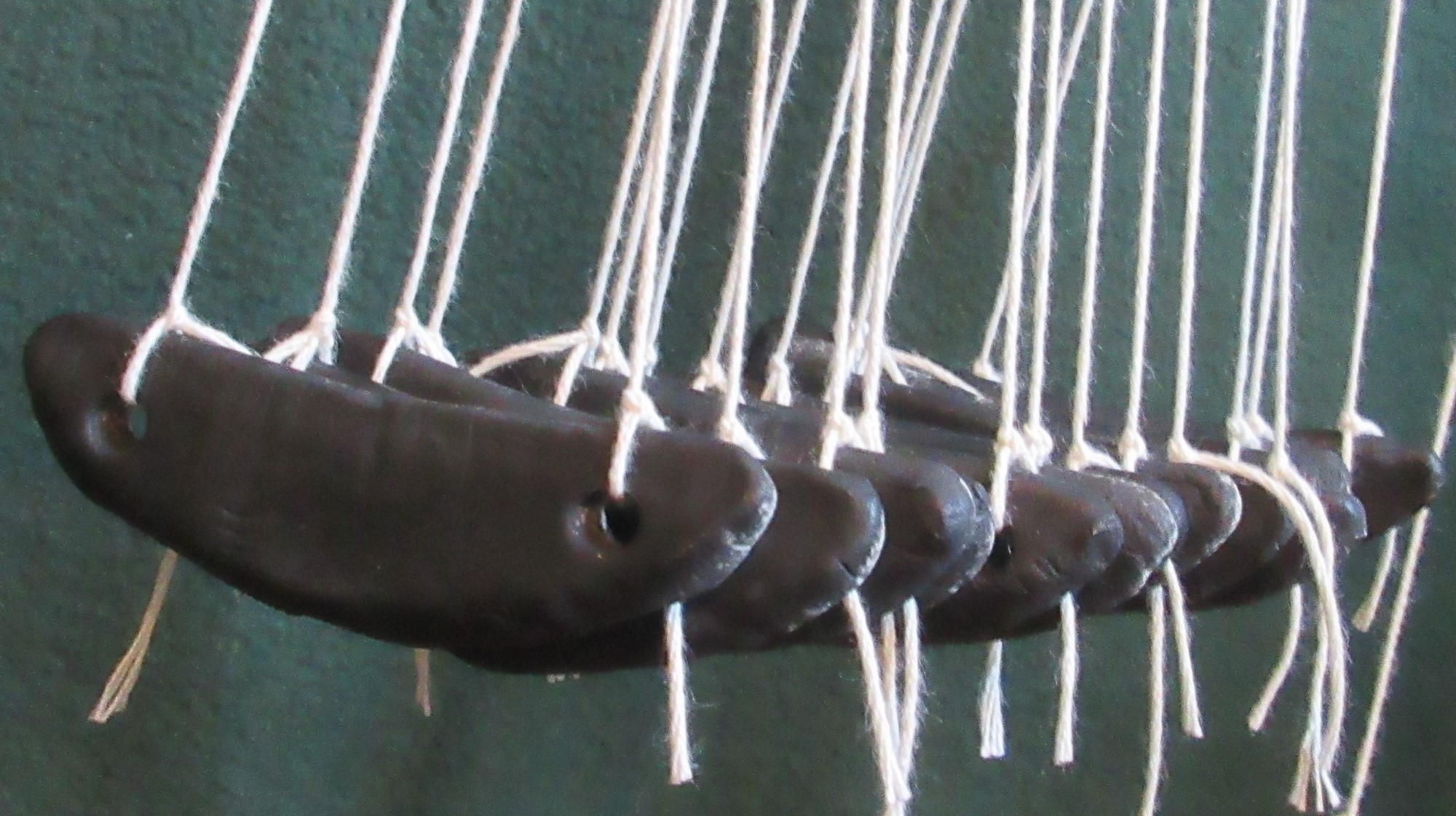 For all of these experiments, 26 warp threads were tied to the top bar of the loom, and then one warp thread was tied per hole in the weights (two warp threads per lunate weight), with the first thread tied in the proper right hole and the second tied in the proper left hole, so that all of the lunate weights were evenly lined up across the warp, and all lunate weights were initially facing to the artisan’s left. The separation of the holes in the lunate weights creates a primary “natural shed,” with the odd warp threads toward the back of the loom and the even warp threads toward the front of the loom (See Figure 7). Although the mass of the lunate reproductions is relatively light, the reproductions illustrated that they worked very well with the two cordage types in these studies, providing ample weight to provide stable tension for the warp, but not so much weight that they strained or threatened to break the cordage used.