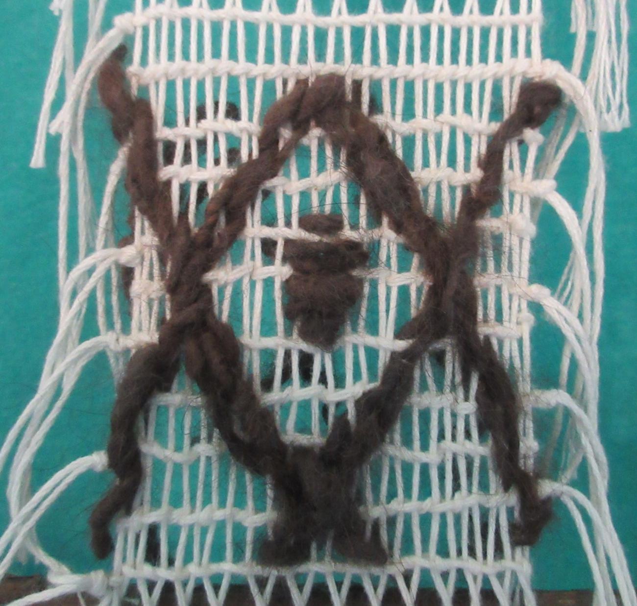 As with transposed crossed diverted-warp weft twining, the lunate weights provide the necessary flexibility in the warp for this structure and placing the lunate weights flat in front of the textile facilitates this process by holding the progressively widening diverted warps in place.