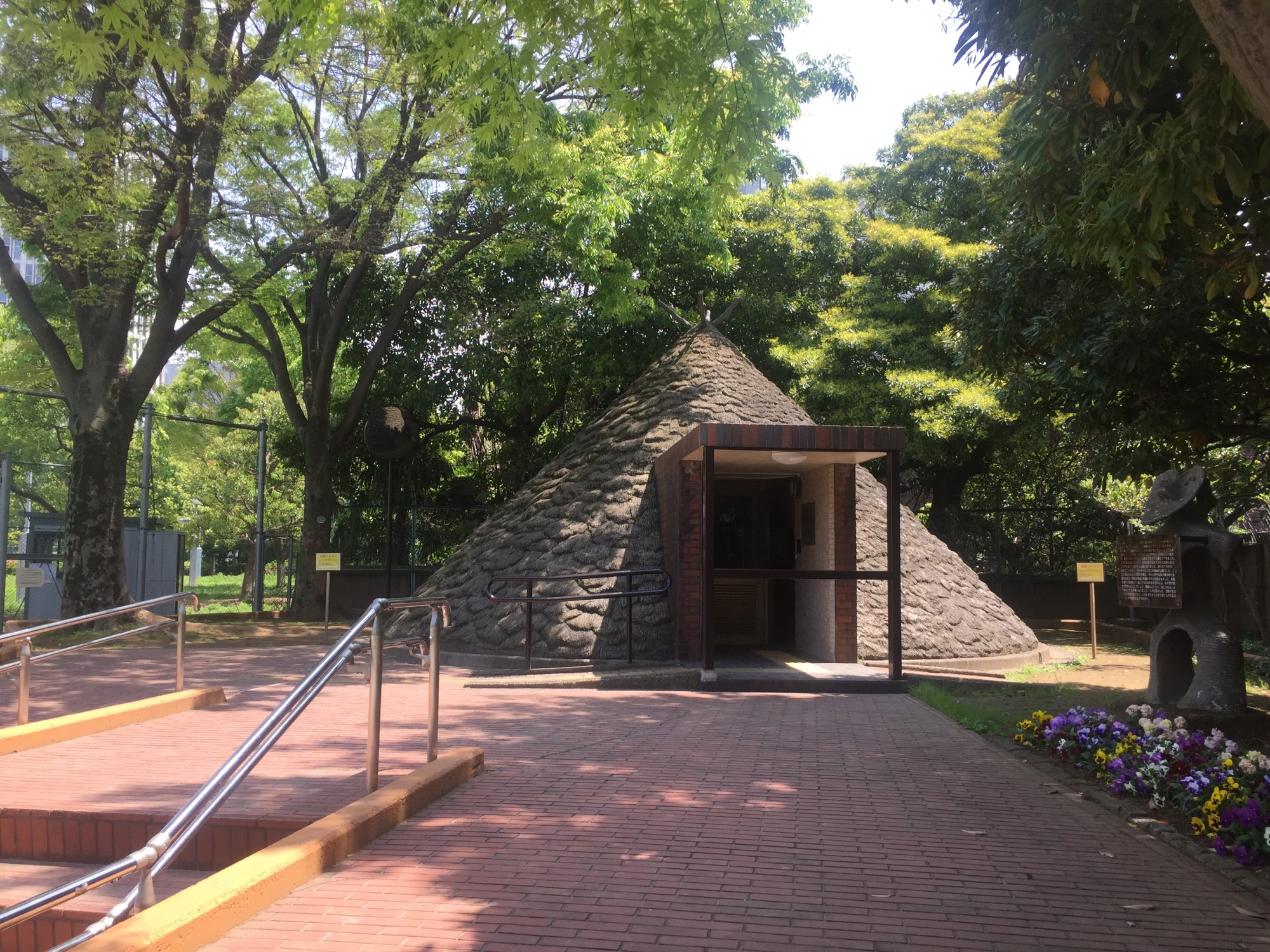 There is a faded information panel at the entry to the park. It explains that 28 pit house features were excavated from 1946 to 1952 and that the first pit house was designed by Horiguchi Sutemi. The final line is noteworthy as it reads: