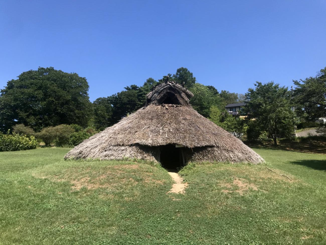 Horiguchi’s concerns with combining Japanese tradition with western modernism can be seen in his pit house design, with its off-center entryway and roof structure based on farmhouses from the countryside (Horiguchi, 1951, p.1). The first Jomon pit house based on his design was built in 1949. Since then, the pit houses at Togariishi have been rebuilt, relocated and the numbers of buildings have changed. Today six largely identical buildings are spread out over a grassy plain surrounded by a stream and woods. These were built in 2000 as part of a major remodeling of the grounds and adjacent museum. Now 20 years old, the thatch has started to rot and has been removed from some of the buildings.