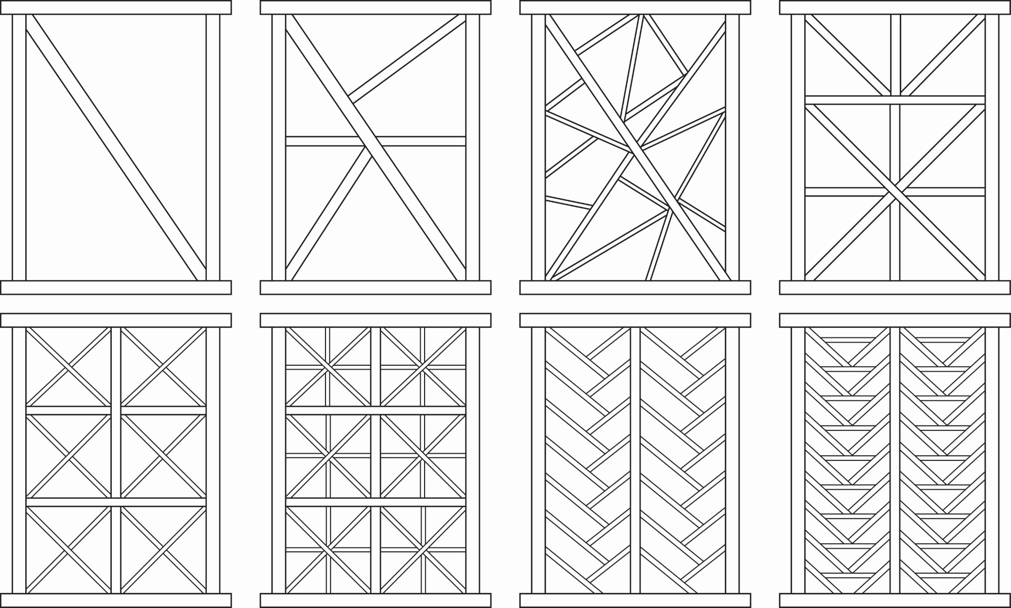 "The primary structural elements are generally thinner than those of their European cousins (colombage, Fachwerk). The secondary sub-divisions are made of board-sized short pieces nailed to the primary elements. The subdivision patterns can vary from stiff cross-bracings to ever more ductile zig-zag, chevron, fishtail or random assemblies." 9