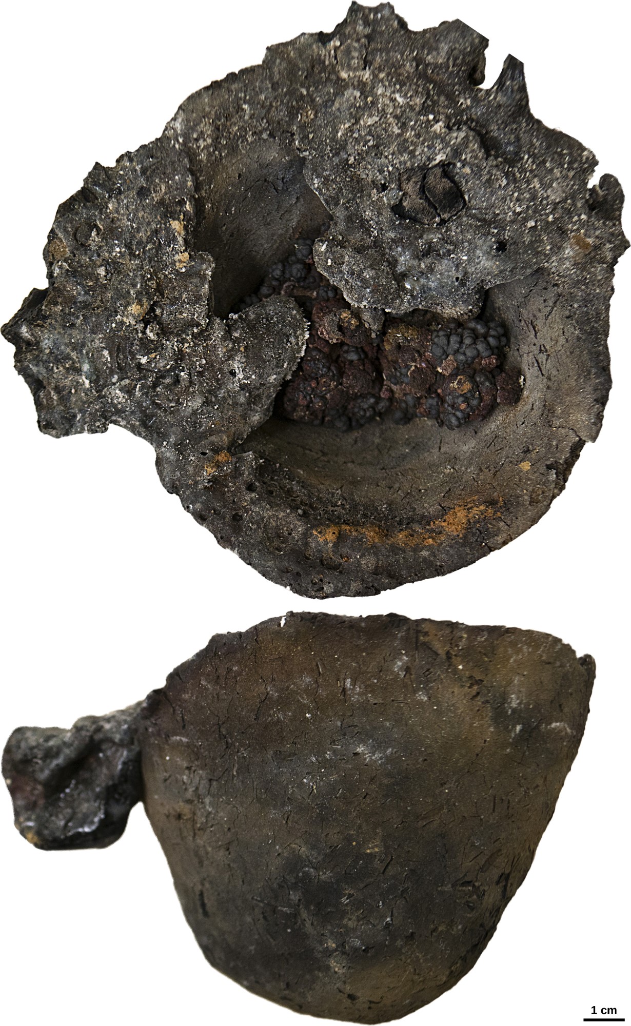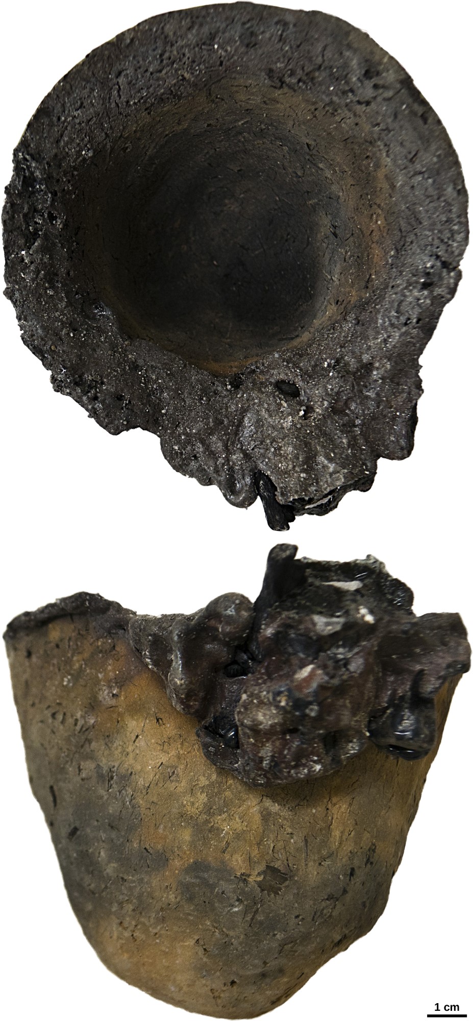 In the third and fourth run, crucibles made with Fazael clay were used. In both runs, the crucibles were placed in the centre of the furnace and heated for 81 min. During the third run, a small amount of metal melted. The tuyère melted and affixed itself to the crucible, contributing to the slag on the rim of the tuyère-facing crucible side and possibly acting as a flux for the Fazael clay. Outside this area, only the rim of the crucible was slightly vitrified (See Figure 6). For the last run, the furnace was modified to be operated with two bellows by creating a second opening in the furnace wall at a 90° angle to the initial one. Melted material from both tuyères flowed on the crucible and partly covered it (See Figure 7). Although the crucible showed a more substantial impact from the heat than the crucible in the previous run, parts of the rim opposite the tuyère did not melt. Some metal was melted, but its bright colour indicates that it was mainly antimony.