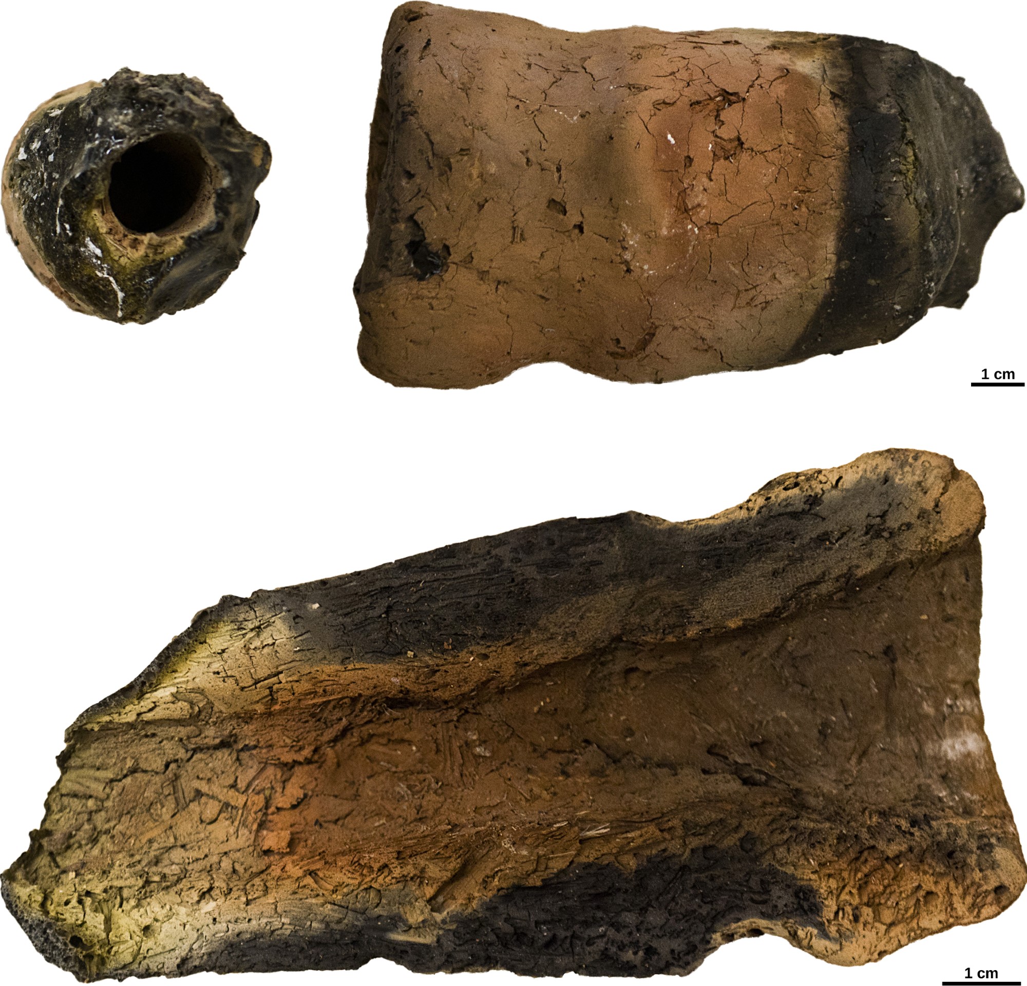 Chaff and clay were mixed in a 1:1 volume ratio for the crucibles and tuyères. A similar ratio was aimed for when preparing the furnace walls and pit lining in the field. Water was added until the paste was not sticking to the fingers anymore. All objects were shaped by hand. Additionally, a stick was used to make the draught channel of the tuyères. Occasional drying cracks were repaired when the objects were leather-hard. Afterwards, the crucibles were thinly slipped to smooth the surface.