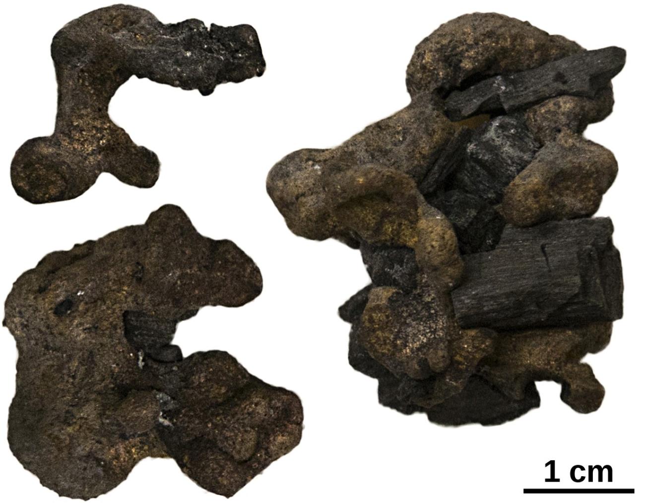 On top of the difficulties in adequately arranging the crucibles and tuyères, the behaviour of the charcoal posed significant problems during the experiment. Compared to beech charcoal, used by one of the authors in a previous experiment, it burned very slowly and crumbled into large numbers of small pieces over time. This effectively blocked the airflow towards the crucible, keeping the hot zone immediately in front of the tuyère. At the same time, charcoal outside of the hot zone burned very hotly without additional draught.