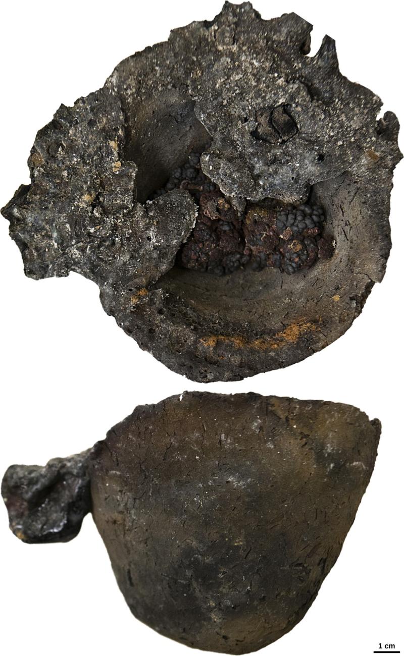 The experiment was carried out in late August 2020 at the Nahal Beer Sheva west of Tel Sheva. After the kindling of the fire, the furnace was slowly heated, and glowing charcoal accumulated until it reached the top of the furnace walls. When it reached 900°C, the bellows were used to increase the temperature to about 1200°C. The tuyère of the bellows was plugged into another tuyère, which then entered the furnace (See Figures 2b,c). After nearly two hours of pre-heating, the first of two runs with Negev loess crucibles began (See Table 1). Due to unfamiliarity in operating the pliers, about half of the metal batch was spilled onto the charcoal when the crucible was placed. It was positioned close to the opening of the furnace wall with its rim on the same height as the draught. In all runs, the crucible was covered with charcoal, and the bellows continuously operated to heat it. After 76 min, the crucible was taken out of the furnace. It was strongly affected by some spalling and occasional heat cracks. The currently visible extensive cracking and spalling, however, developed after the experiment (See Figure 4). The tuyère-facing side was considerably melted or vitrified. Similarly, the length of the tuyère was strongly reduced due to melting.