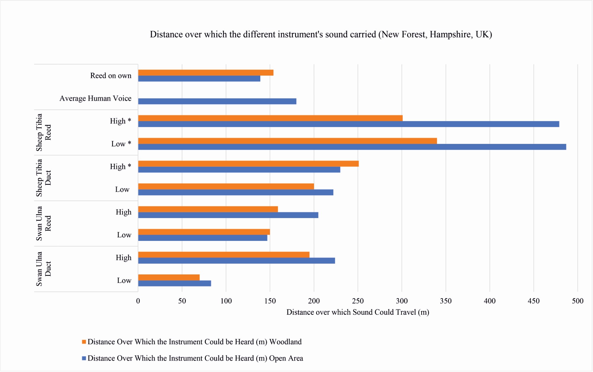 The recreations based on the Wicken Bonhunt and York bone pipes sounded as both duct flutes and reed pipes and therefore could have been either (See Video below). Bone pipes with no distinguishing sounding mechanism should not immediately be categorised as duct flutes. To further understand these instruments, it was important to test the bone pipes in as close to the original environment as possible. To accomplish this, the instruments were recorded, and the distance over which the sound could be heard was measured in both an open environment and a woodland environment. A location was selected where sound pollution caused by industry today was minimised as much as possible to replicate the conditions of the Early Medieval world. The weather conditions were mainly sunny with some gusts of wind (between 17 and 21 degrees Celsius). It was decided to test in both an open area and woodland as these are two relatively different environments in terms of how the sound acts and would potentially give different results. The Wicken Bonhunt bone pipe was found in a demesne farm, with few other buildings around it. Therefore, the instrument being tested in such environments is particularly appropriate for this instrument, and if it is found to have carried over large distances, would suggest it could have been used for signalling while outside. The York instrument was from an urban environment but testing instruments in such an environment today is complicated because the level and composition of sound pollution is so different today in urban areas. Future research may be able to assess this further.