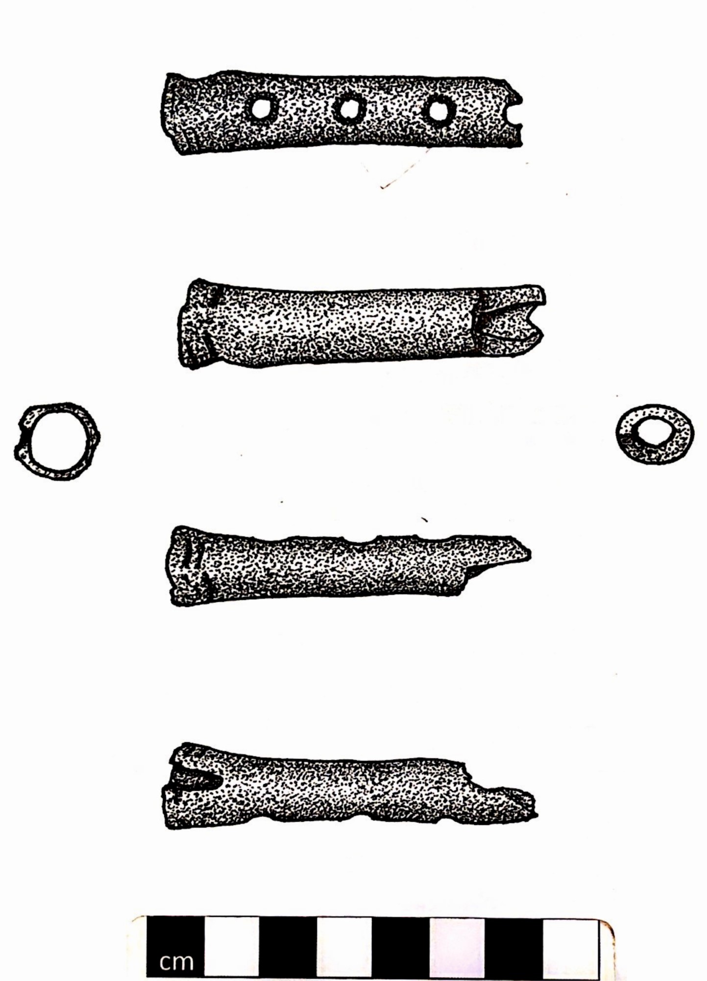 | Pipe | An instrument consisting of a tube which could be voiced in a variety of ways including as a flute or reed pipe. In this paper, the term ‘bone pipe’ will be used unless the pipe can be more narrowly categorised. The overall category for these instruments, as designated by Hornbostel and Sachs (revised), is aerophones and often to class an object with certainty beyond this general classification, when it is based on interpretation, will lead to misunderstanding and confusion (Wyatt and Benito, 2016, pp.198-199). |