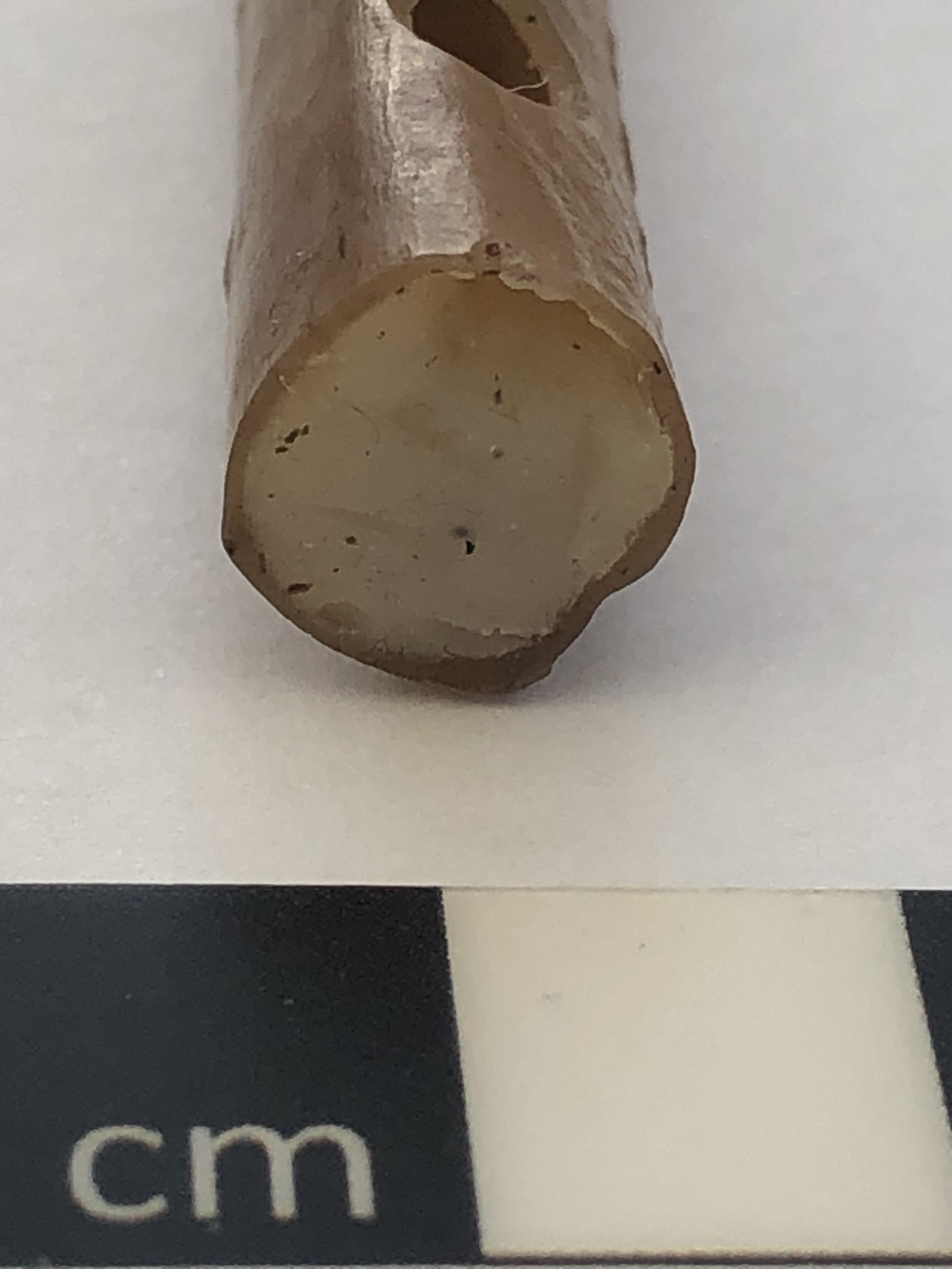 Bone pipes dating from both the early and late medieval period have been found in the archaeological record from across central and Northern Europe such as in: The Netherlands (Tamboer, 2004), Denmark, Sweden (Lund, 1981a), Poland (Poplawska, 1998), Latvia (Urtan, 1970) and Estonia (Oras, 2015) (Tamboer and Rainio, 2020). One of the first comprehensive studies of these instruments as a whole is that by Brade, published in 1975. Bone pipes are among the most common sound-producing artefacts found in the archaeological record of Early Medieval England and have been comprehensively catalogued in Leaf’s 2008 PhD thesis (Leaf, 2008). This work assessed the archaeological contexts and physical aspects of the bone pipes, including bone type. Leaf generally designates these bone pipes as ‘flutes’, and states that bone flutes are duct flues (Leaf, 2008, p.28). Researchers such as Graeme Lawson, have previously suggested some of the finds designated in her thesis as flutes, such as one from Winchester, Hampshire, may have been reed pipes (Lawson, 2009, p.524). Lawson also suggests reed pipes were more likely to have been made from metapodials, potentially with horns added, while flutes were usually made of: Ovicaprid tibia or swan, crane, or goose ulna (Lawson, 2009, p.524). Mammal, such as ovicaprid, metapodials used for reed pipes have also been identified in research by Annemies Tamboer and Riitta Rainio (2020). In both these publications, it was suggested chamfering at the end may have been due to inserting the pipe into a hollow terminal such as a horn, potentially secured in place with a material such as beeswax, for use as a hornpipe or bagpipe chanter (Lawson, 2009, p.524; Tamboer and Rainio, 2020, p.120).