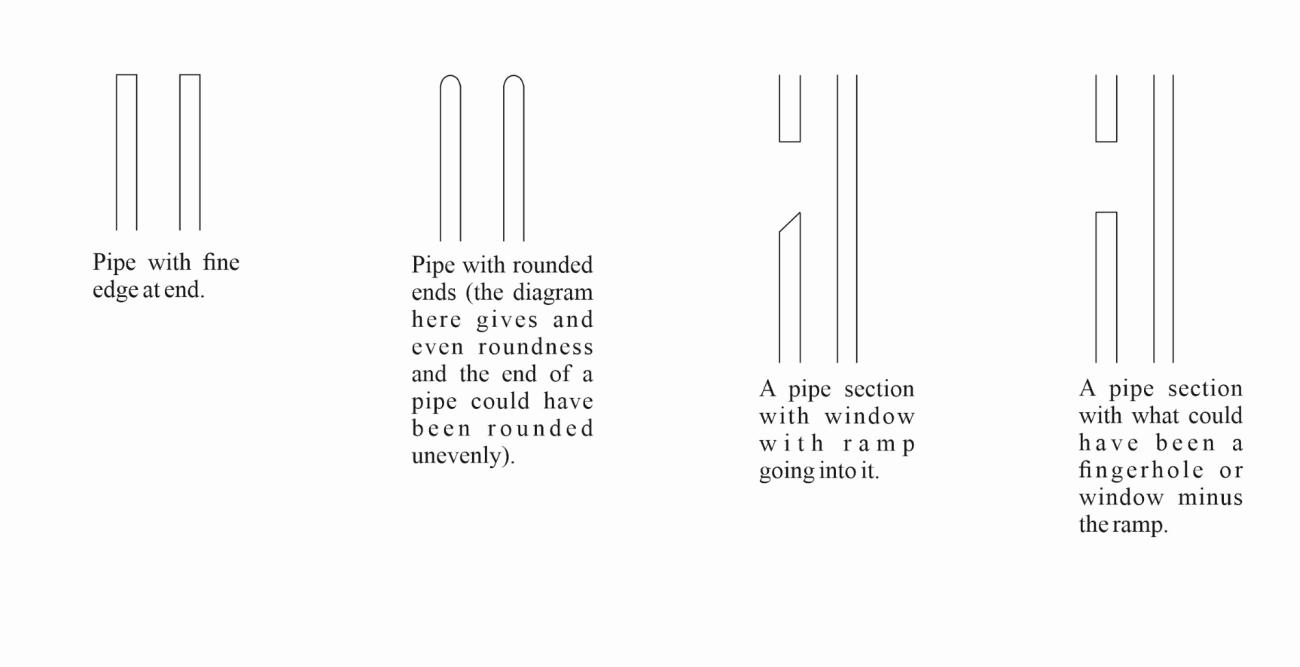 One aspect which can be used to identify a duct flute is the presence of a window or fipple. However, fipples/blocks have rarely survived in the archaeological record due to them being made of organic materials (Dallas, 1993, p.159). Tongue-duct flutes were also possibly used in both the ancient and medieval periods and would consequently not have had a fipple/block (Lund, 1981b, pp.108-109). These instruments are considered to have been relatively widespread, having been found in places such as Greece and the Soviet Union (Emsheimer, 1981, pp.103-105). Consequently, even if an instrument is found with no hint of duct/fipple, categorisation as a duct flute must not be discounted. The presence of a window, often designated as an opening on the side of the top end of the bone pipe with a ramp leading into it, can identify an object as a duct flute. If the pipe shows signs of having been finished at both ends with no clear window, the object could not have been used as a duct flute. How finished the ends are is sometimes ambiguous. The part of the pipe containing the window may have been lost, or the window confused for a fingerhole (See Figure 1), or vice versa, meaning the lack of a window is not enough to say the bone pipe was not a duct flute. While finished, rounded ends may mean the pipe was more likely to have been a reed pipe or lip-vibrated pipe, the lack of a fine-edge does not discount the pipe working as an end-blown pipe (See Figure 1). Previous experimentation has shown that while pipes without a fine-edge can be played as an end-blown flute, they require a higher air pressure and do not allow for lower fundamentals to be sounded compared to when an end-blown flute is played with a fine-edge (Wyatt, 2012, pp.393-394). These illustrate the potential problems and why a careful examination of any finds is essential. The proposal of function of the pipe beyond use as an aerophone is interpretation and should therefore be treated with caution (Lawson, 1981, p. 31).
