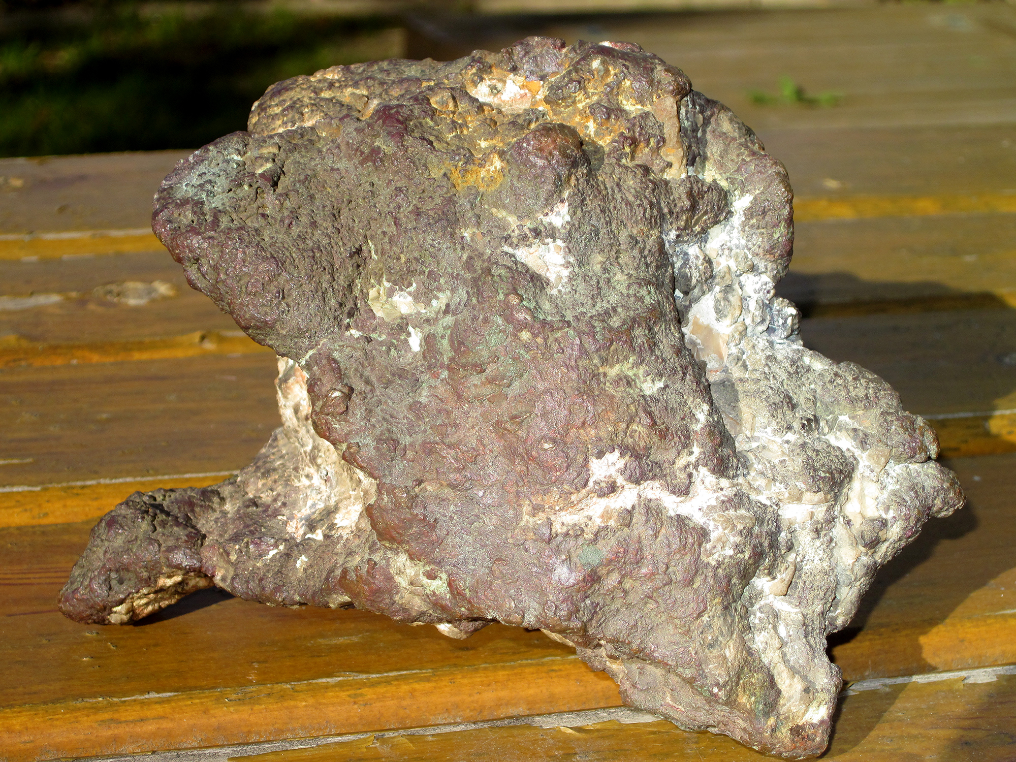 The iron-ions can, together with oxygen and water, form the mineral goethite (FeO (OH)), which is virtually insoluble and therefore remains in the upper part of the ore body. There the goethite can, together with other minerals, form a durable “cap” usually referred to as “gossan”. Unlike the iron-ions, the copper ions, the carbonate ions and the sulphate ions can percolate and form copper-rich minerals above the water table (“oxide-ores”) as well as below it (“sulphide ores”). Malachite (See Figure 3) has the chemical formula Cu2(OH)2CO3, and its building blocks are: Cu2+, OH- and CO32- (Robb, 2005, p.41): The hydroxide ions (OH-) derive from the water and the carbonate ions (CO32-) from carbonic acid and calcium carbonate (CaCO3) in neighbouring limestone rocks. In acidic environments, these ions cannot react to form malachite. In alkaline environments, e.g. in the vicinity of limestone rocks, malachite can be formed. Therefore, malachite is often found together with limestone. The area with the best conditions for the formation of malachite is the oxidized zone, just above the water table where the lowest acidic level in that zone can be found. This is also the case when it comes to the formation of native copper, which can be illustrated by the equation below (Killick, 2014: 19):