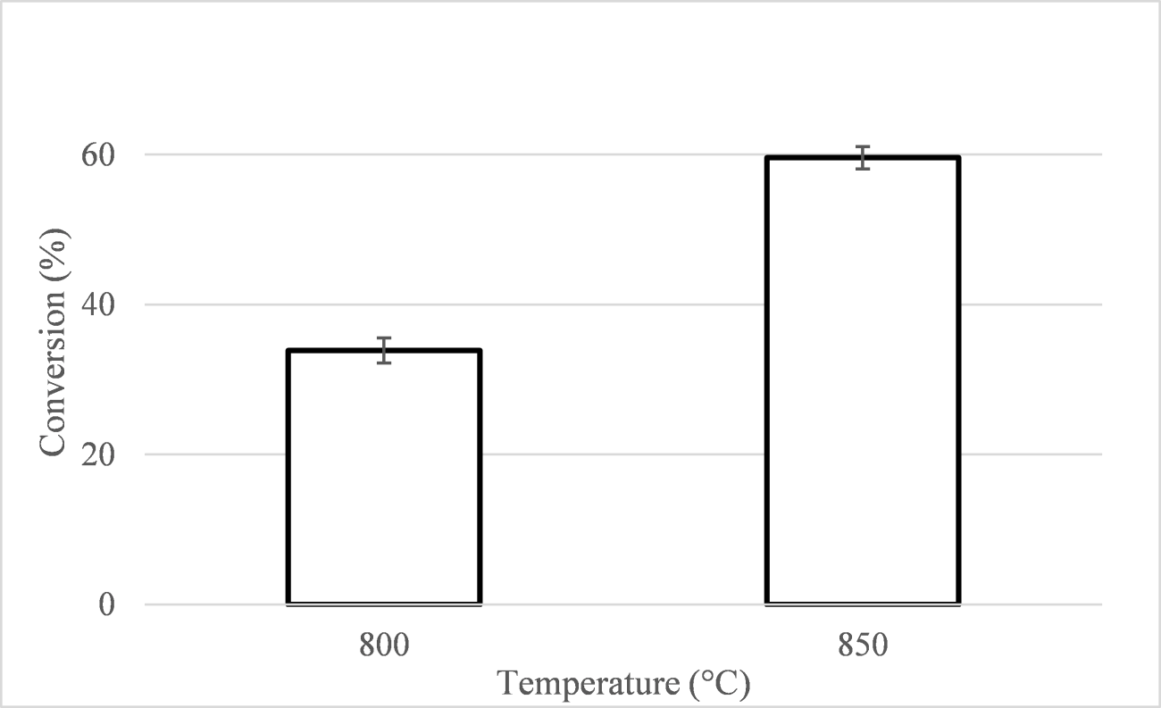 The results of limestone conversion at the temperatures investigated are presented below in Figure 10 (mass basis on the conversion of CaCO3 into CaO). The results show that limestone conversion occurred in the experiments when heated to 800 or 850Âş C. The results show that the extent of conversion of CaCO3 to CaO increased when treating the material at 850Âş C compared to 800Âş C. CO2 was produced from the thermal treatment in the experiments, which further indicates the role of the Boudouard equation to generate a reducing atmosphere for the formation of pure copper.