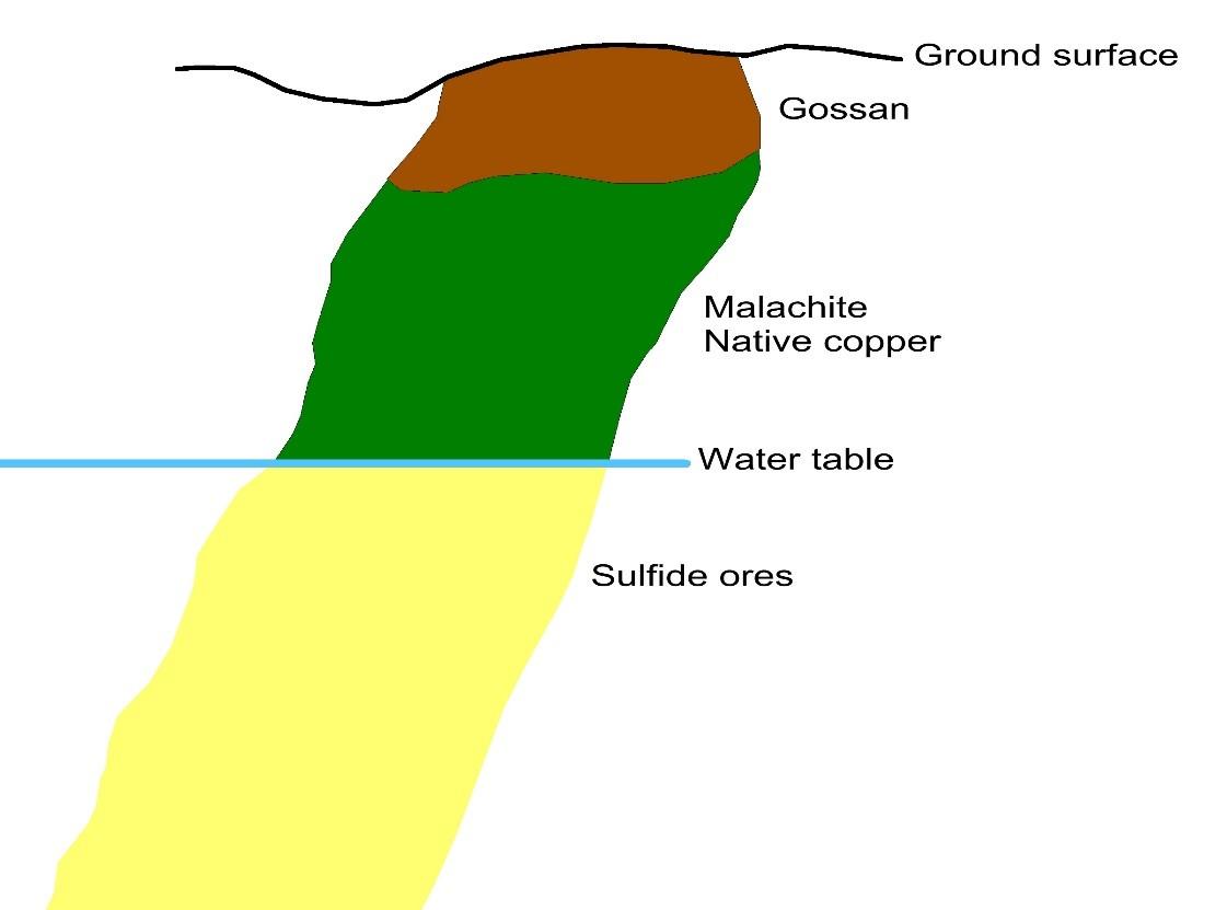 Figure 2 is a schematic representation of a copper deposit, in which weathering and alteration of minerals are taking place. The chemical conditions above the water table are oxidizing and acidic, whereas the conditions below the water table are reducing and often slightly alkaline. The acidity is most pronounced in the uppermost part of the oxidizing zone and least just above the water table. These differences have a profound influence on the formation of minerals. They control which minerals will be formed and where each mineral will form. Let us imagine an ore body, mainly consisting of chalcopyrite (CuFeS2), with access to the open air. Chalcopyrite is usually accompanied by pyrite (FeS2). When rainwater is seeping down, it can bring oxygen, carbon dioxide, and carbonic acid to the ore body. The two last compounds partially derive from decomposing plants above the ore body. Pyrite can, together with oxygen and water, produce sulphuric acid, which, in combination with the carbonic acid, can make the water sufficiently acidic to destabilize the chalcopyrite, thereby liberating copper-, iron-, and sulphate ions (Robb, 2005, pp.238-239; Golding and Golding, 2017, pp.21-24). The disintegration of chalcopyrite can be represented by the equation below (Loberg, 1993, p.277):