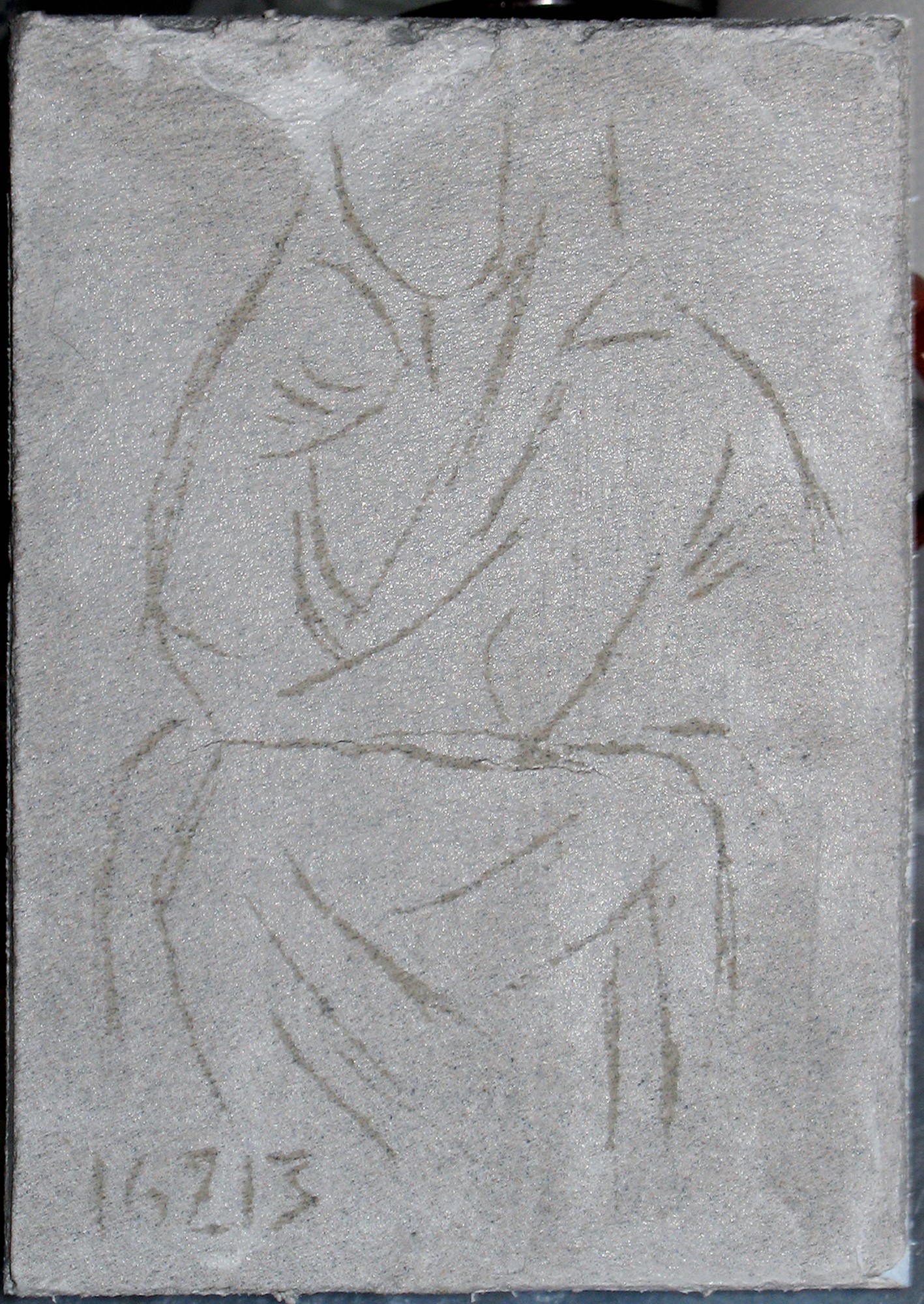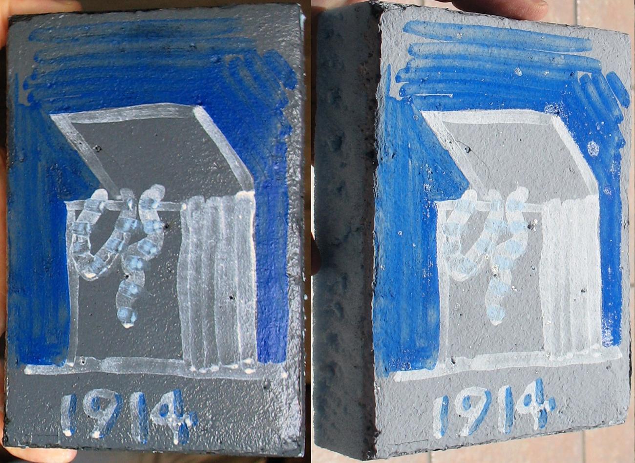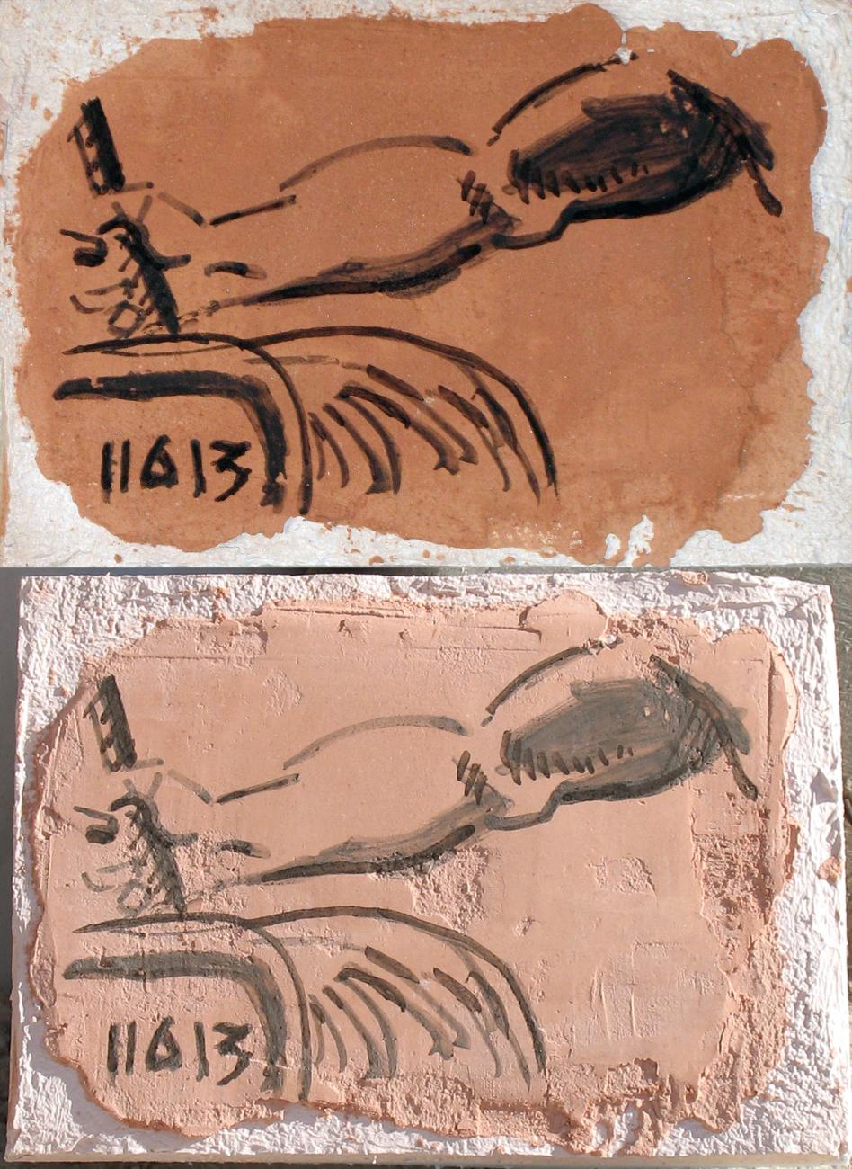 Both the mortar and the colours became matte when they dried. The mortar took on a medium tone of grey that had a blueish hue (See Figure 24). It had become quite light in weight. It was heavier than that of 15513 Ash, but lighter than a mixture of lime with thin sand. The holes from the pierced bubbles were still visible. We observed only one small crack in front of the date of the sample (See Figure 25). The mortar generally worked well. The proportion of lime and charcoal also appeared to be correct. We believe, however, that charcoal should not be the only aggregate in the mixture. It would be more appropriate and more durable if the mixture contained some sand. A mixture such as that of the base mixture of sample 14613-13913 Ash is more appropriate because the dominant aggregate is sand, and charcoal is only an additive in a small amount.
