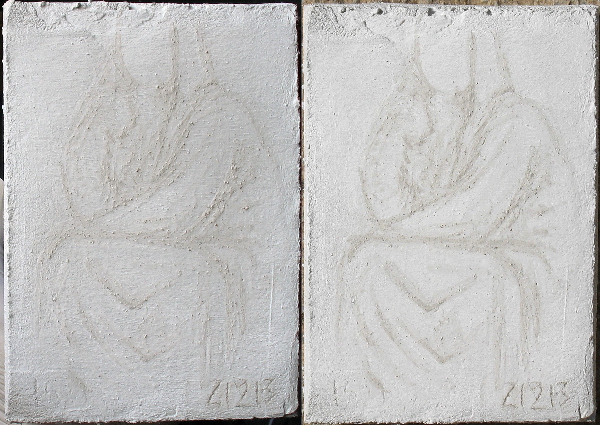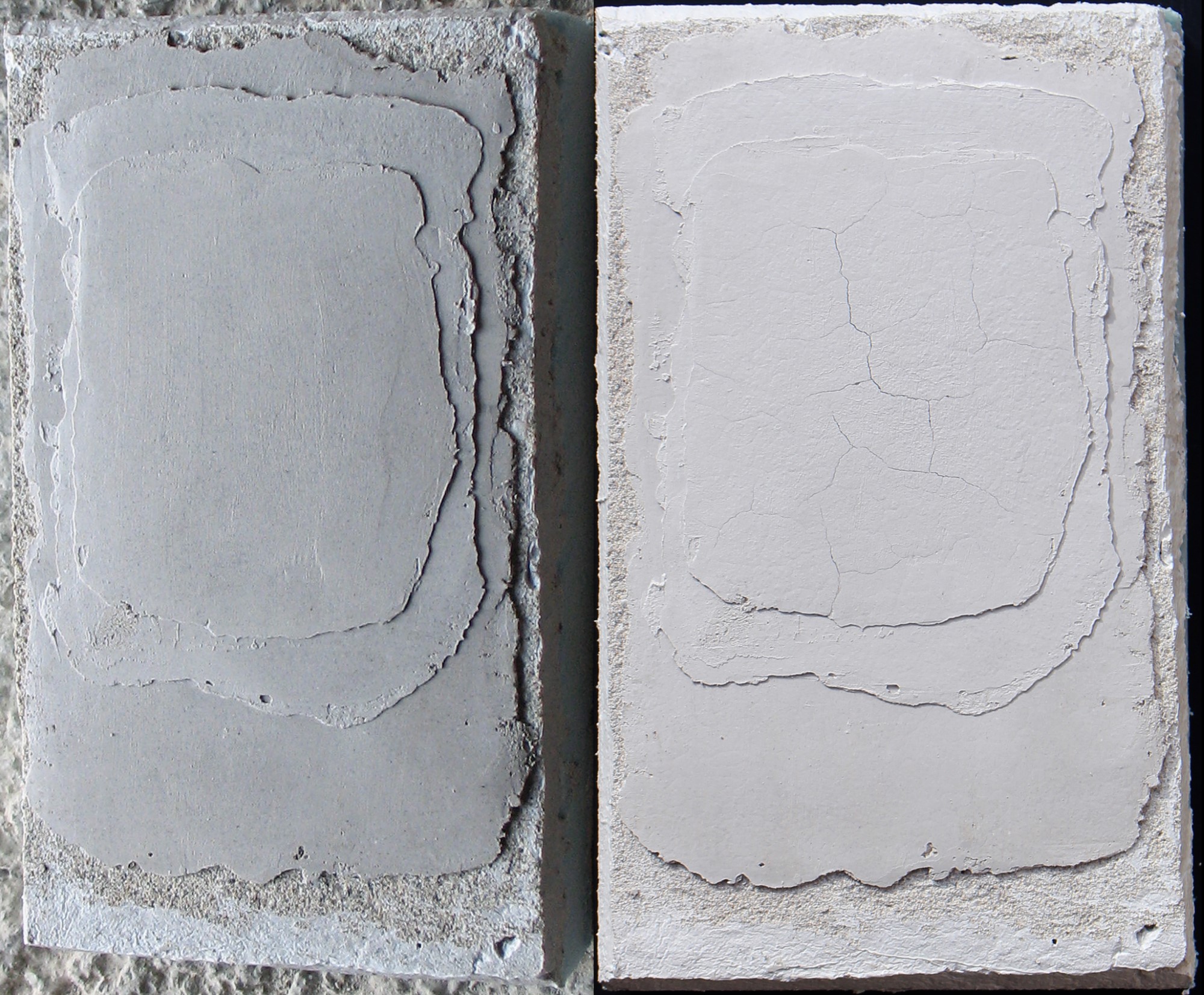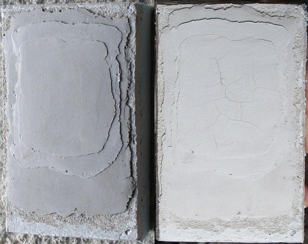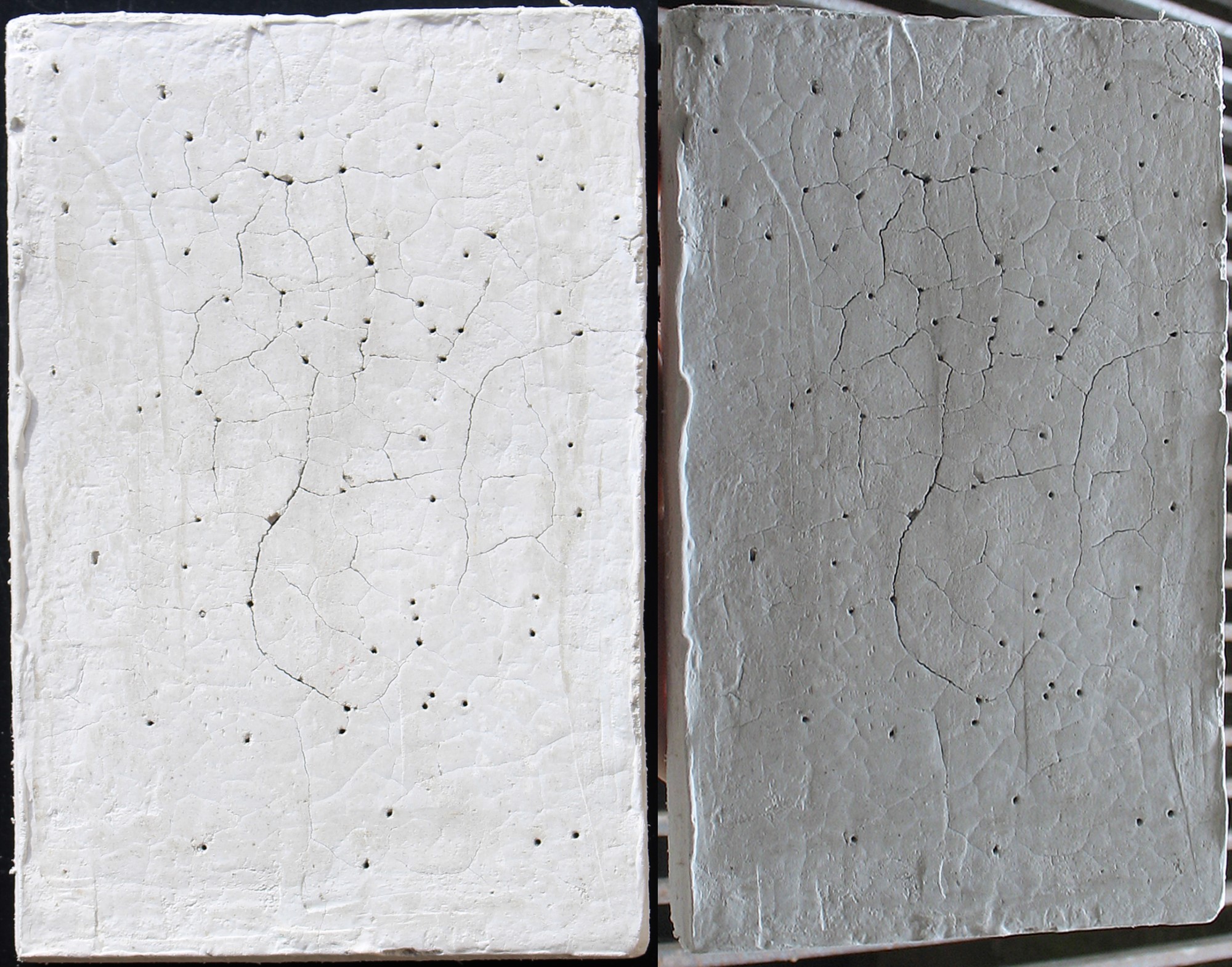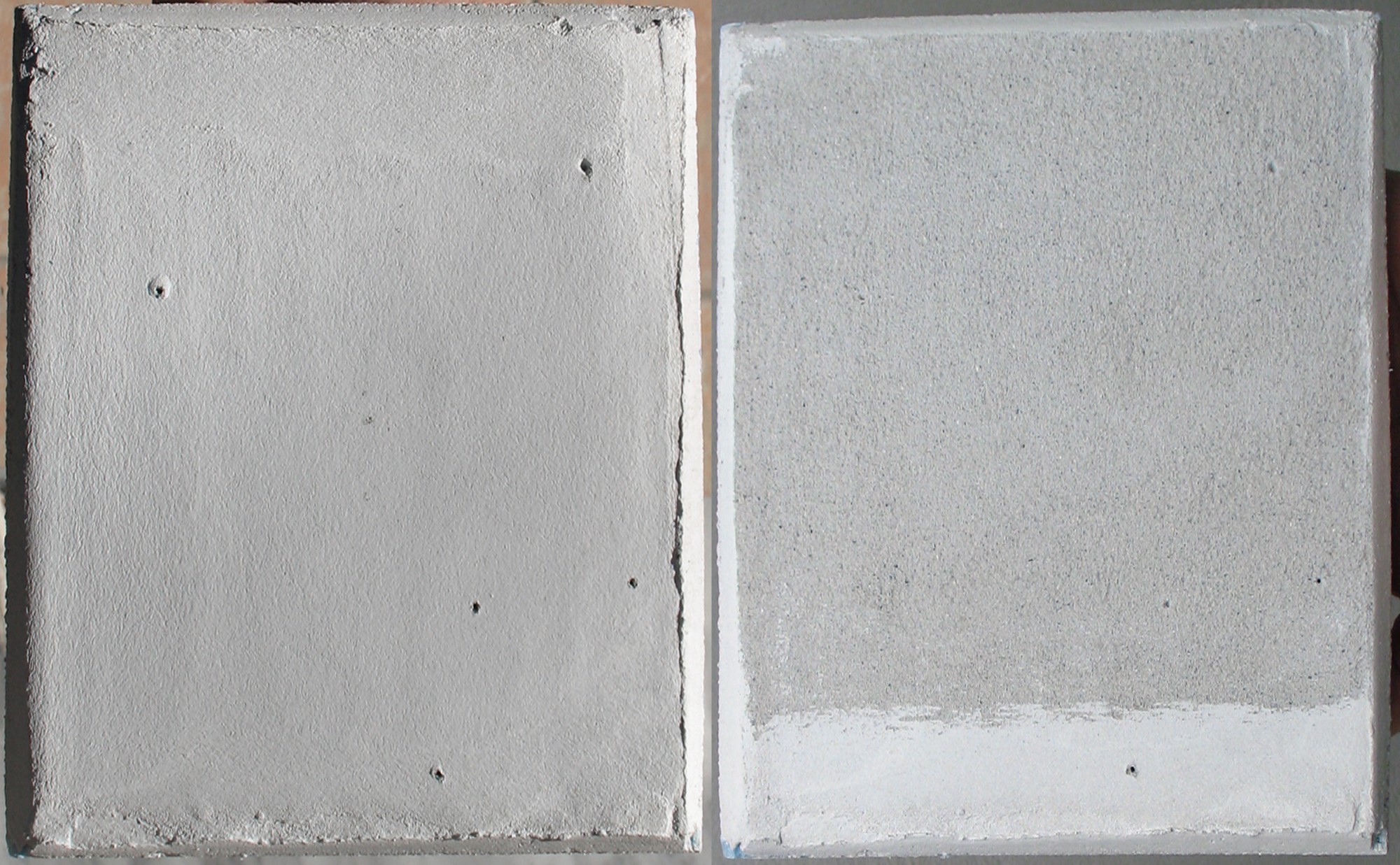 | 14613-13913 Ash | 1 lime : 1,5 fine river sand : 0.25 ash : 0.25 charcoal (thin sand size) | 14/6/13,1 layer placed on a polystyrene surface | 18.7 cm × 17.1 cm × 7.5 mm (top surface 18 x 15.7 cm) | 2A: 1 lime : 0.5 ash | 13/9/13, spread in 3 doses, 30 minutes apart, over the wetted base coat | 1st dose 14.5 cm × 8 cm × 1 mm, 2nd dose 13.9 cm × 7.4 cm × 1 mm, 3rd dose 13.5 cm × 7 cm × 1 mm. |
