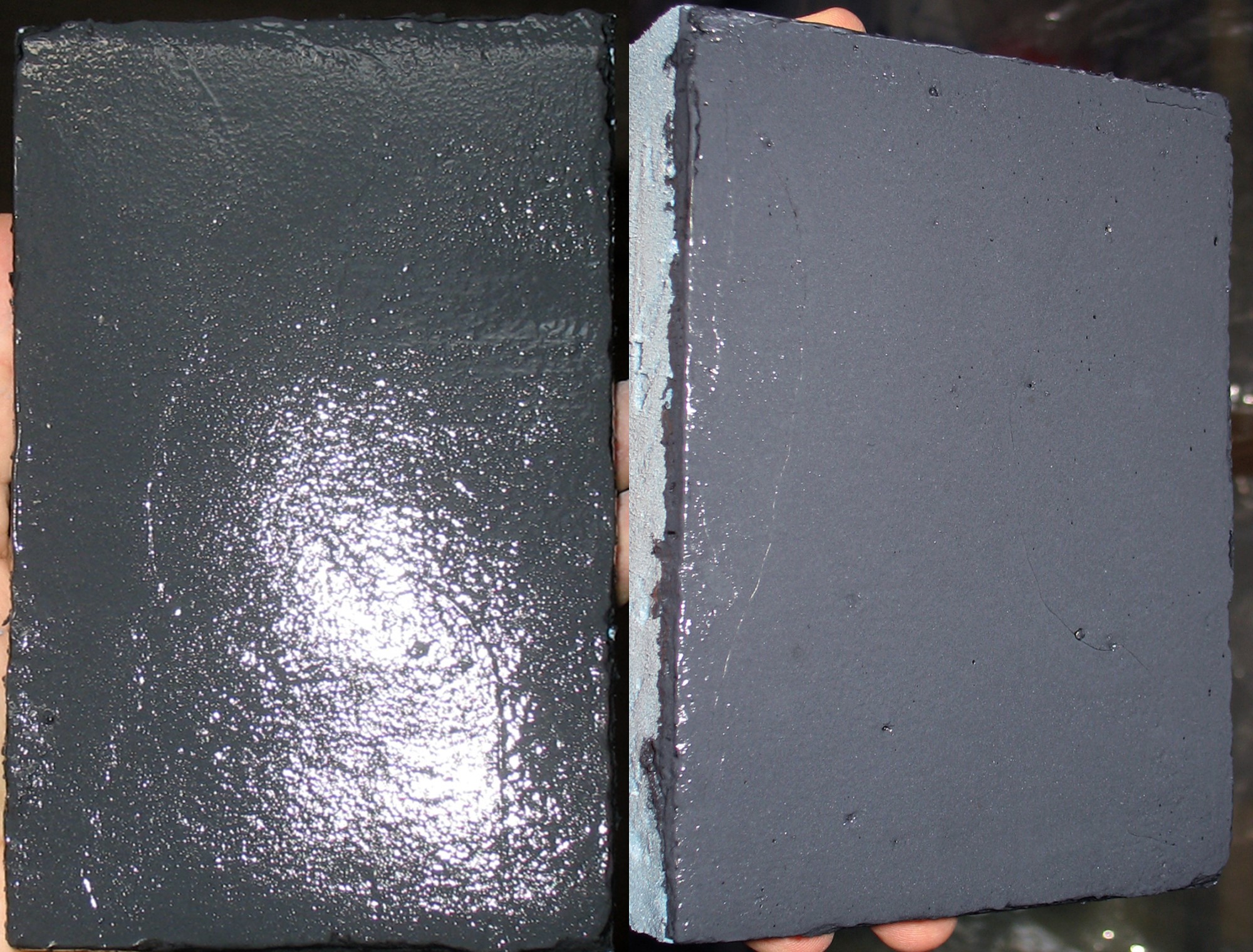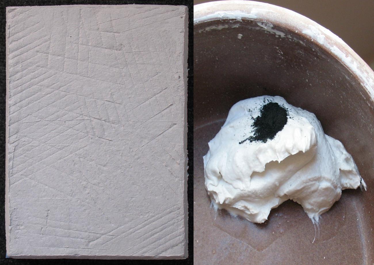 The base layer of the sample was a mixture composed of 1 lime : 1.5 fine river sand : 0.25 ash : 0.5 oak charcoal crushed into thin sand-sized pieces. It was spread in one layer, 7.5 mm thick, on a polystyrene surface. It took a lot of effort to make the mortar because the materials did not seem to mix with each other. The mortar was also difficult to mix because it was lumpy. It was, however, easier to mix than the base mixture of sample 15513 Ash. The mixed mortar felt quite dry and had a texture similar to clay (See Figure 5). The dark grey mixture was easily spread because it was stiff. The next day we observed five blisters on the surface of the layer. They were punctured with a pin so as not to cause cracks. Charcoal absorbs and retains moisture, which helps the mortar stay moist. The ashes reacted with the moisture of the lime, a reaction that caused the blisters. No new blisters were discovered after 24 hours. The surface of the layer was tight, but touching it revealed that there was plenty of moisture on the inside. The mortar was still cold to the touch three days later, which indicated that it retained moisture within. The surface of the mortar had a satin gloss when it dried. Its colour was a shade of grey with a hue towards blue. The sand allowed the mixture to be spread as a thick layer, made it more stable, and more compact than that of sample 15513 Ash. The holes from the blisters reached down to the polystyrene and were 1 mm in diameter. The blisters did not lead to cracks or stretch marks. Before placing the next layers three months later, the surface of the base layer was scraped with fine sandpaper, wetted with water, and left for 5 minutes (See Figure 6). When we spread the next layers over it, we observed that this mixture could hold moisture. Charcoal as a material retains moisture, which helped the mixtures that followed to behave better.