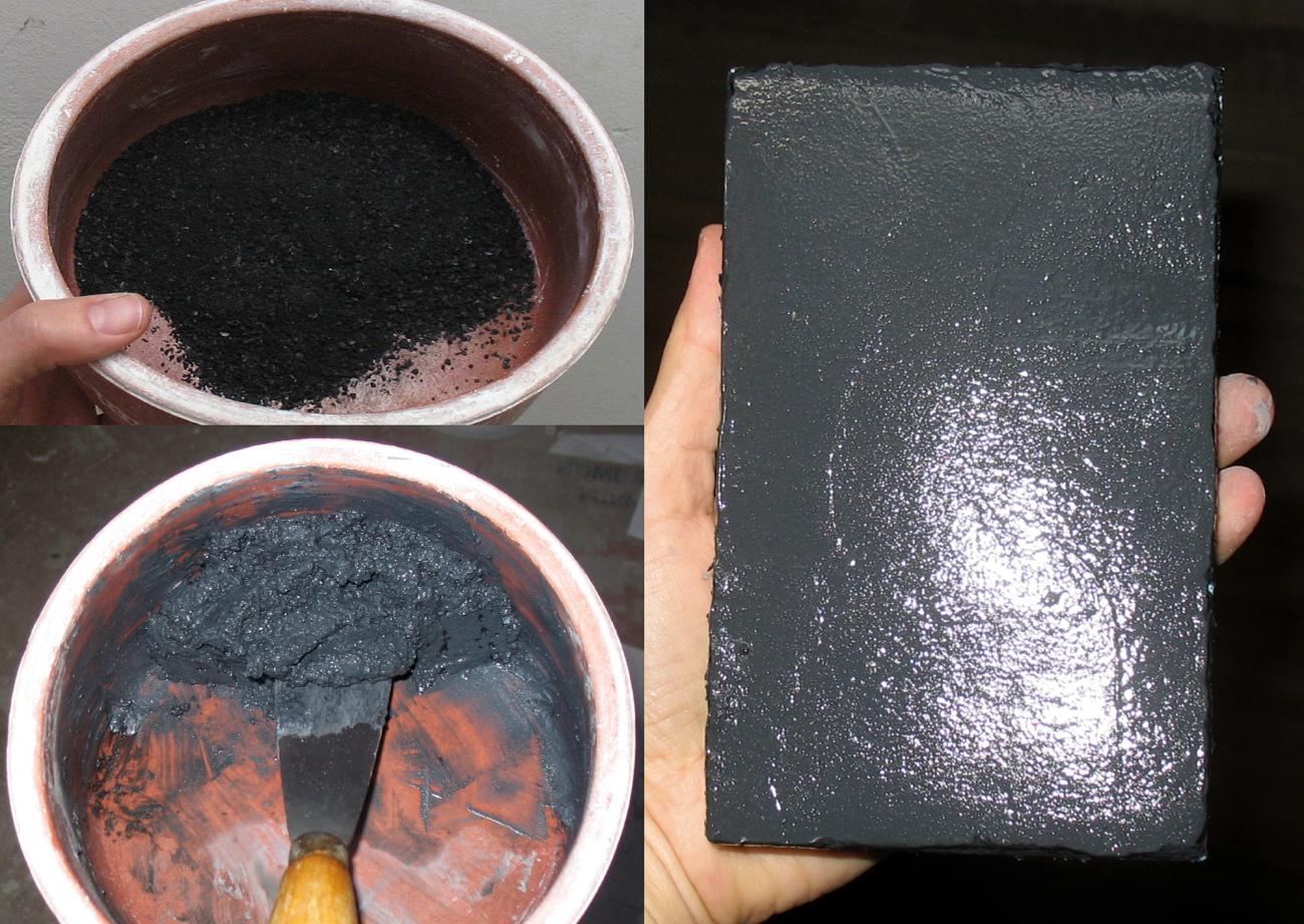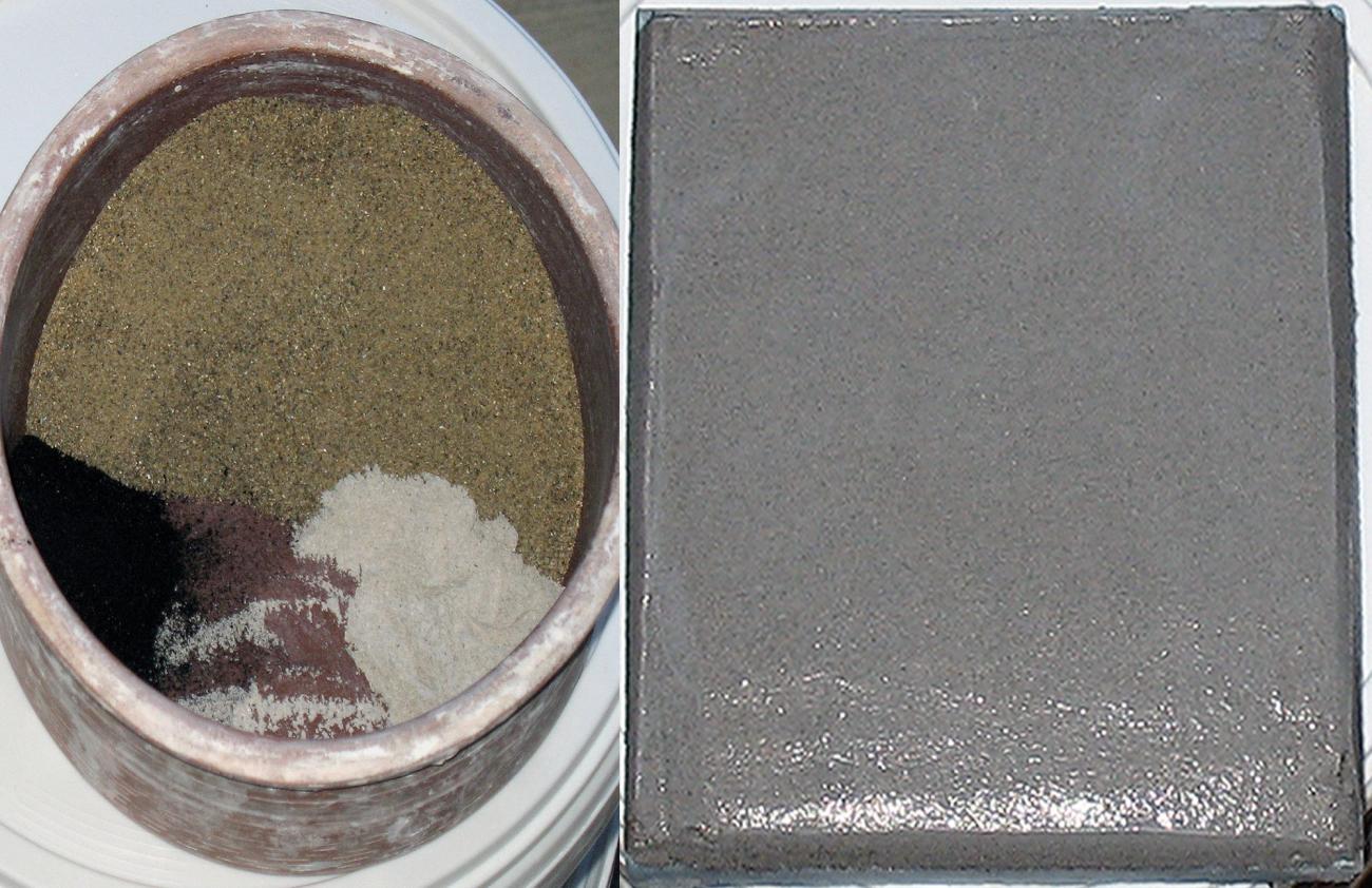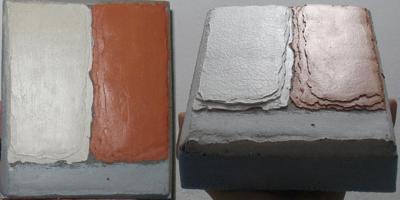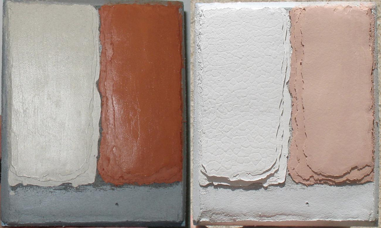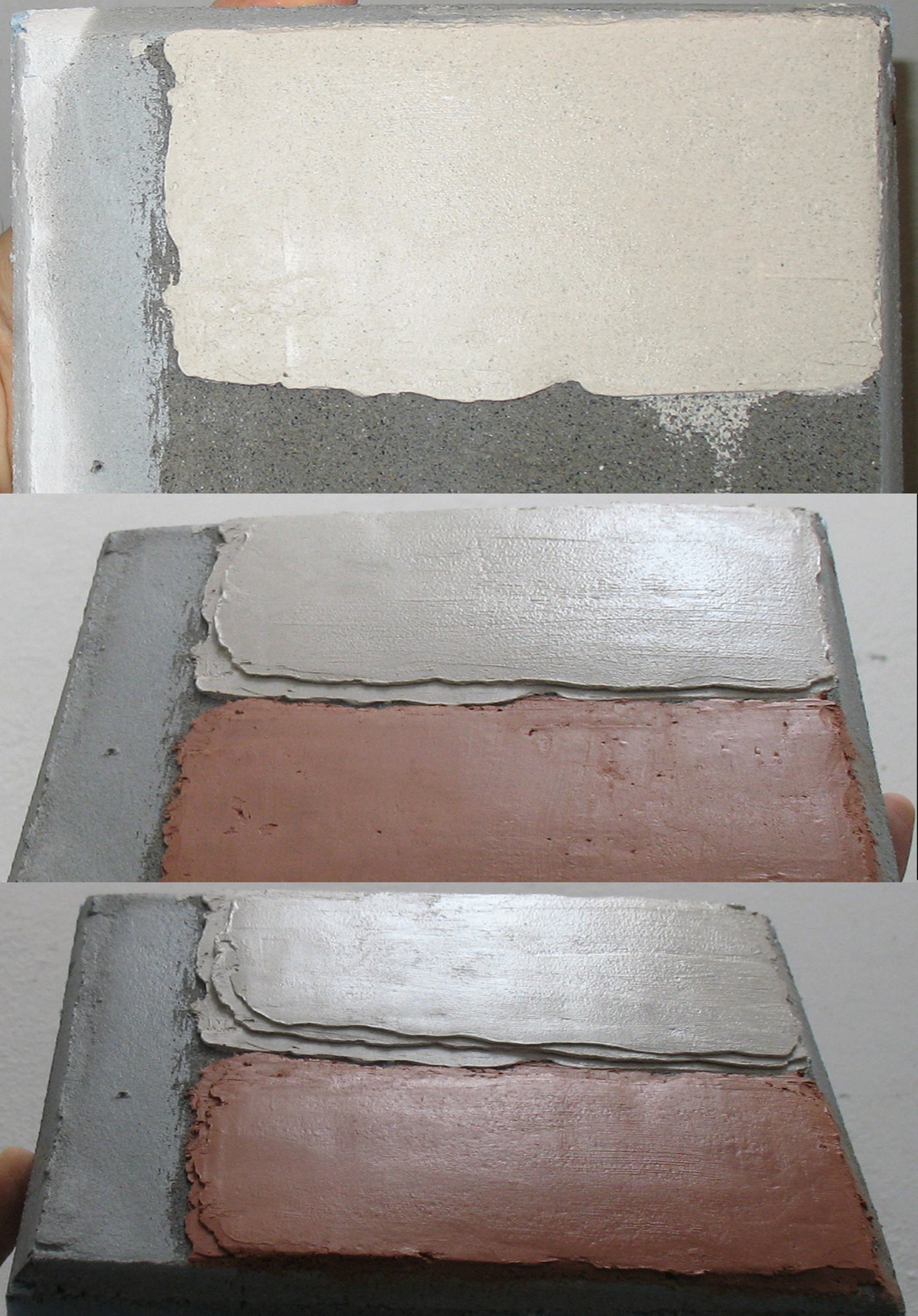 The first layer of the sample was a mixture of 1 lime : 1/3 ash : 1/3 brick powder : 1 medium marble chips. A single layer, 5 mm thick, was spread on a polystyrene surface. The mortar was easily mixed, which we attributed to the small amount of ash. The fresh mixture had a dark orange colour. When it dried, it became pinkish-white in hue and a glossy texture. It had several stretch marks on its surface but no cracks. Before placing the next layer one month later, we wetted the surface with water. The mixture retained a lot of moisture, which was expected from the quantity of the brick powder it contained. When the quantity of ash in a mortar occurs in low quantities in relation to the other materials, it does not affect its behaviour significantly. The surface of the ash mixture was covered by a single 2 mm-thick layer of a mixture of 2 lime : 1 marble powder : 1 brick powder : 1/20 water (See Figure 4). This layer was painted in fresco, and it dried without problems. The pigment used to paint the sample was a soot-black (made by us) that was mixed with lime and with lime emulsion (1 lime : 1 water). When the sample dried, the colours had a matte texture and had adhered well to the surface.