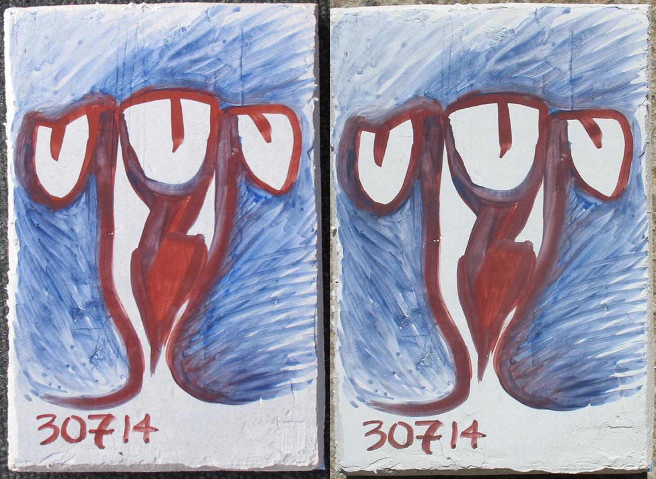 | 2B: 1 lime : 0.5 ash : 0.5 brick powder | 13/9/13, spread in 3 doses, 30 minutes apart, over the wetted base coat | 1st dose 14.5 cm × 7.5 cm × 1 mm, 2nd dose 14 cm × 6.8 cm × 1 mm, 3rd dose 13.5 cm × 6 cm × 1 mm | ||||