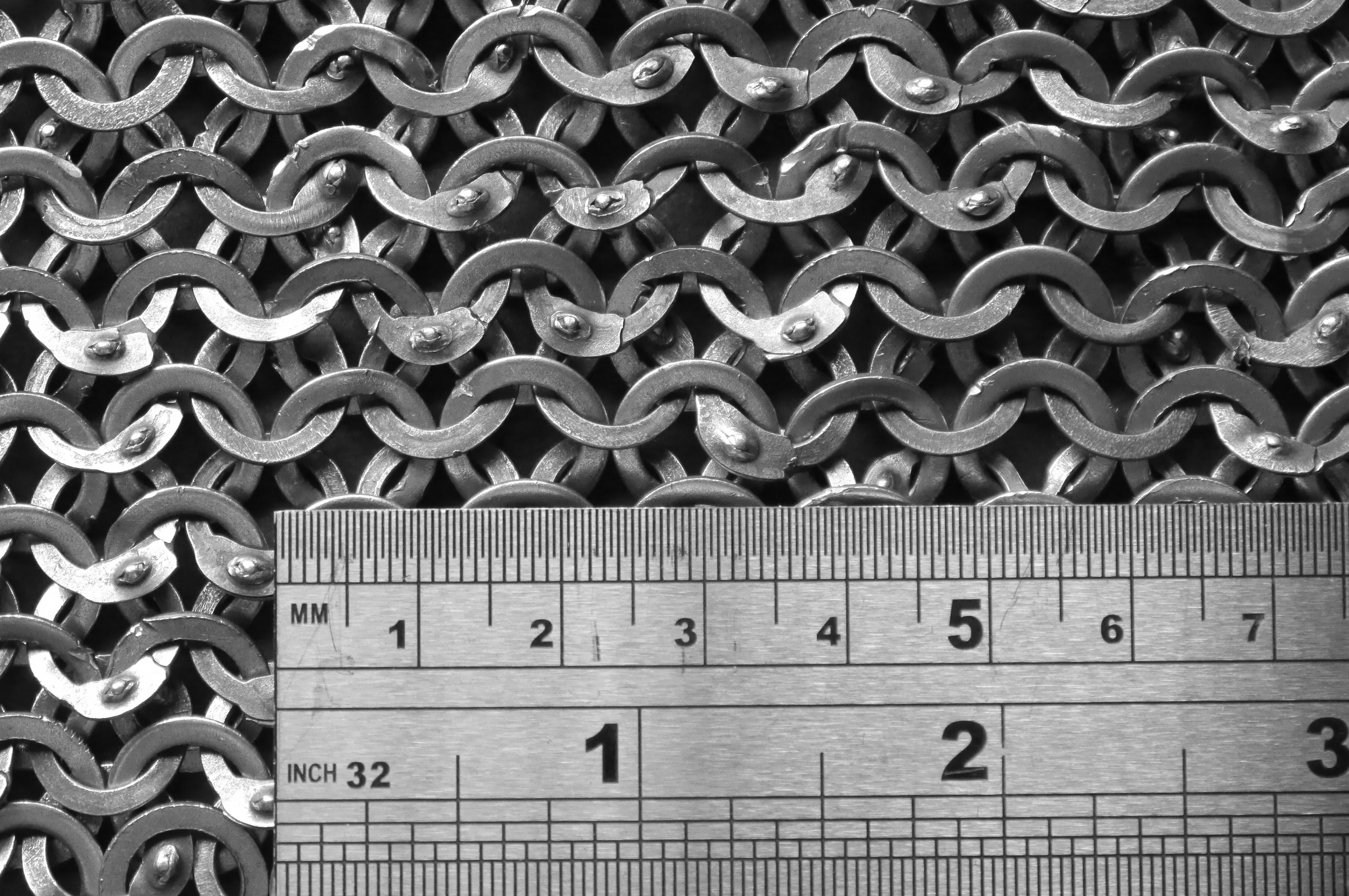 A 0.2×0.2 m square of mail was made by one of the authors, with alternating rows of solid and wedge-riveted mild steel rings. The mail rings are manufactured in India to supply the re-enactors market. The rings were carefully inspected and any rings with defects were discarded. The mail was made in the “four in one” pattern with each riveted ring passing through four solid rings and vice versa. The rivet was set with pliers having a flat face on one jaw and a dimple in the other jaw, giving a flat lower surface and a raised rivet head on the upper surface of the mail (See Figure 4). After setting the rivet it was inspected, and if the joint was unsatisfactory the ring was cut out and the riveting operation repeated. The areal density of the mail was 7.95 kg/m2 when stretched out.