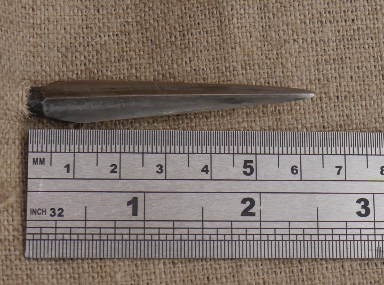 A reproduction M8 long bodkin arrowhead is shown in Figure 2. When shot from a bow of moderate strength (about 70 lb, 311 N) an arrow with this head is capable of penetrating mail armour to a potentially lethal depth, exceeding 40 mm at almost every shot, unless there is a substantial thickness of padding beneath the mail. To a large extent the degree of protection is determined by the thickness of the padding. In one series of tests, with a bow of 65 lb (289 N) draw weight, a15 mm thickness of compressed woven linen under the mail was needed to prevent penetration exceeding 10 mm (Jones 2020, p. 169).
