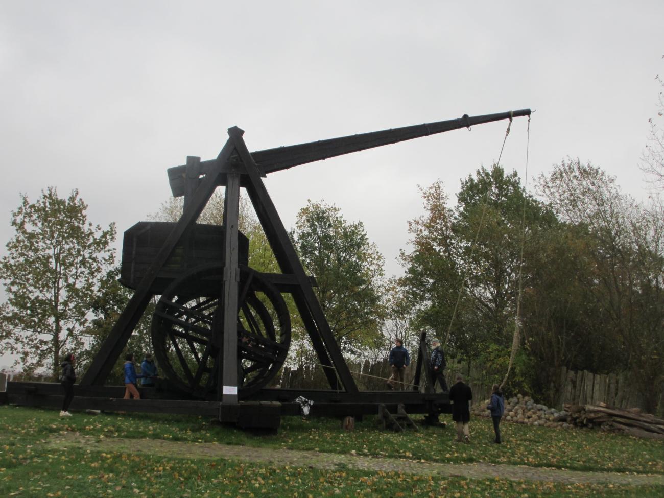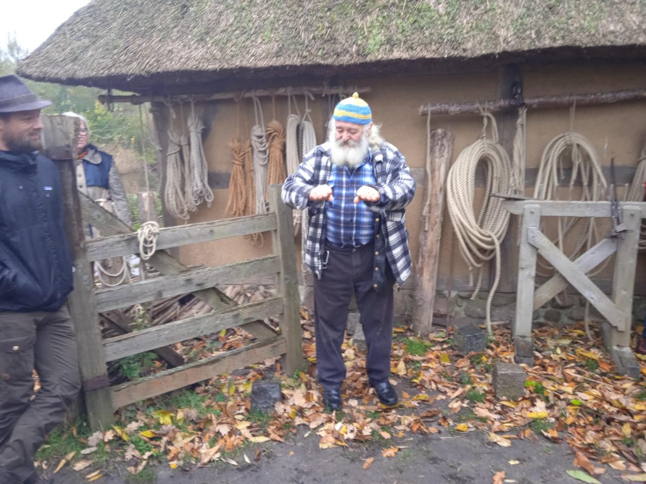 The second part of the day focused on practical demonstrations and project displays. Thit Birk Petersen started with a tour of the grounds of the Medieval Centre including their medieval town Sundkøbing built around the year 1395, followed by a practical demonstration of the trebuchet. Thereafter Søren Lise gave a presentation on the practice of rope making. Different rope-making equipment and types of rope were presented as well as how to make these. Due to rain the actual rope making could not take place, but everybody was invited to make rope with him at another time. The next presentation was held by Dorte Kampp, who presented the new loom at the Medieval Centre. It was built using medieval tools and set up as it is believed to have been originally. Textiles made on the loom were presented as well as a practical demonstration of the loom working.