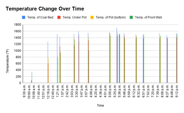 The first firing indicated that the vessels did not properly reach the temperature needed that would change the clay into a non-porous vessel. A second firing was, therefore, necessary, the difference being that this firing began during the night and went for a longer period. The recordings were more focused on the temperatures coming from inside the kiln, the quantity of wood and the time it took to reach certain temperatures. There were shorter stoking times (beginning with 10 minute intervals and then changed to 5 minute intervals in order to get the temperature higher ), so that the fire would be continuously fed but this may have affected the temperatures rising due to the doorway opening all the time causing the fuel to cool and fluctuate. The second firing lasted a total of fifteen hours, with approximately 36.27kg of fuel (the same type of wood as before) and the ending temperature was around 1500 °F (See Graphs 1 and 2).