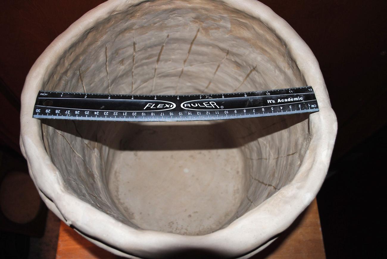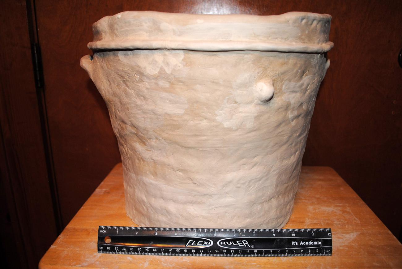 22.68kg of clay were purchased and divided into two separate bags weighing 11.33kg. One bag was used to create a pottery vessel based on the observations made by the measurements within the published Mochlos IB Catalogue. The preserved scored basin that was used as a guide had measurements of approximately .41m in height, .55m in rim diameter, and finally the base diameter was .34m (Barnard, et al., 2003, p.57). Two types of handles were presented in the photograph as well as the description in the publication, so they were translated to this prototype scored basin. The inside scoring was described as either being âXâ shaped or simply diagonal lines going across each other. The latter was chosen in order to give a different perception of the scoring pattern than the red clay and stoneware test pilots. The depth of scoring was not mentioned in great detail within Soles, et al. (2003), but the example made for the experiment stayed at a shallow depth of approximately .010m.