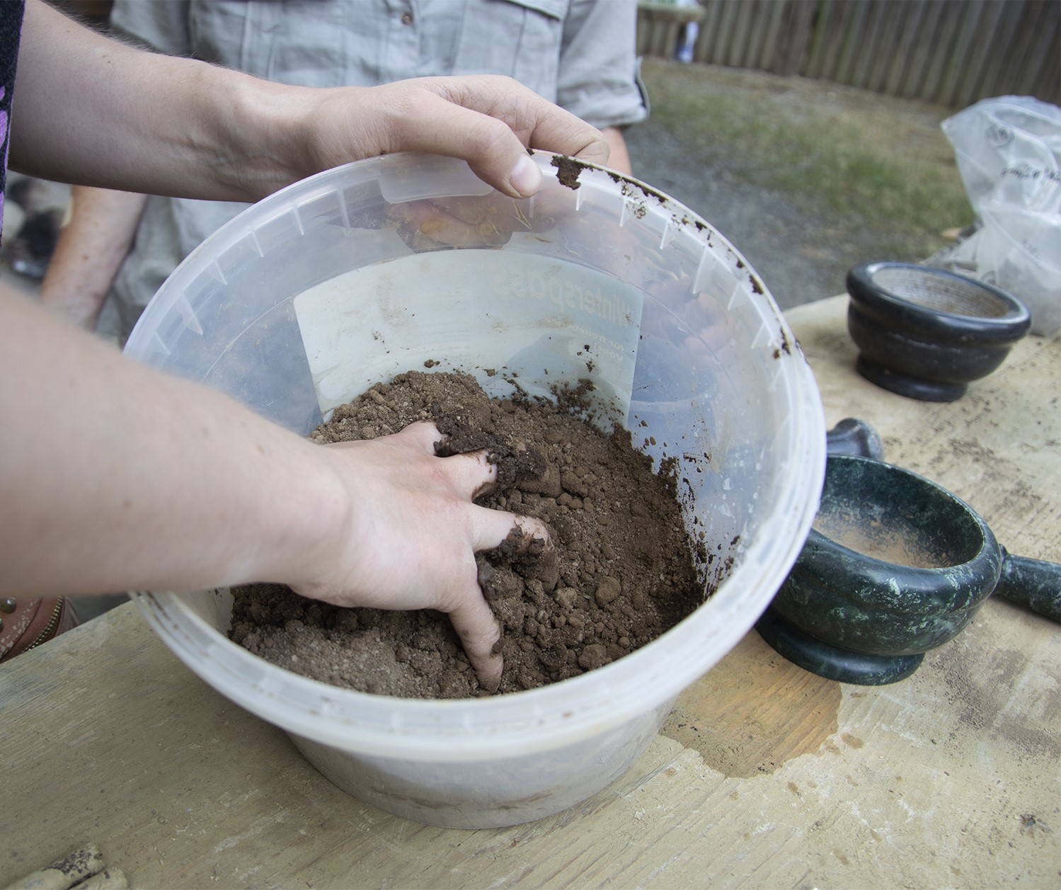 For the preparation of the clay, we employed the same gneiss stones used for grinding the tempers. In addition, three mortars made of different stone were used. The preparation of sample A (by four people) took slightly over one hour, while sample B (prepared by two people) required three hours (including a break). During the preparation, it was noticed that sample B was sandier and harder to manipulate than sample A. Once pounded; the clay was mixed with a little water and kneaded by hand until a homogeneous and plastic paste was obtained (See Figure 3b).