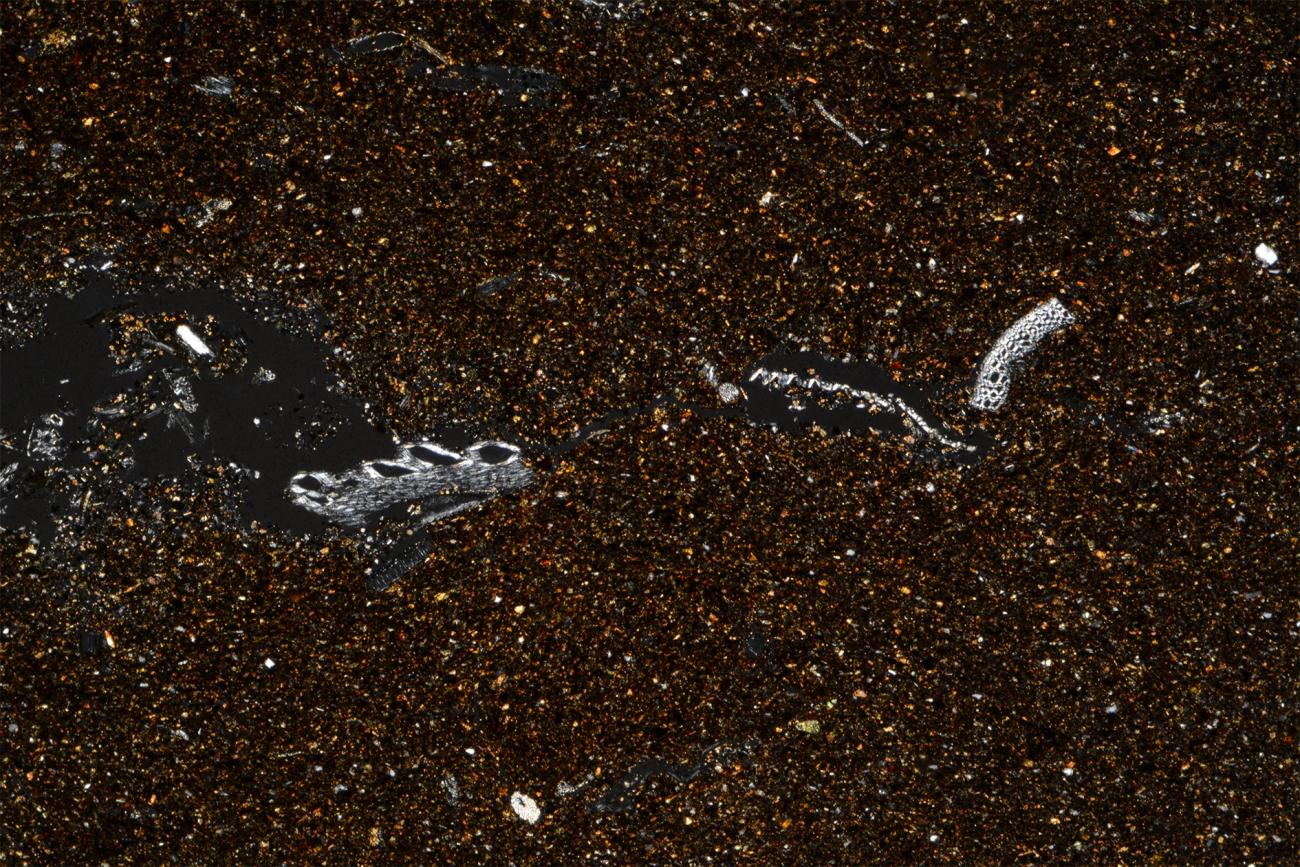Samples 3A and 3B were tempered with goat dung. In thin section, the organic inclusions had an average size of between 0.25 and 0.5 mm, and a maximum size of 1.5 mm (See Figure 13). The vegetal fibres varied in shape and displayed either their longitudinal or transverse section depending on how they were mixed into the paste and how the thin section was sliced. They were generally dispersed throughout the matrix, but they also stacked together, forming larger lumps of organic matter (see Figure 14a). These samples also contain numerous small, high birefringence spherulites. They consisted of radial microcrystalline masses (typically 5–15 μm in size) composed of calcium carbonate, which were typically distinguishable under an optical microscope (Canti and Brochier, 2017; see also Canti, 1998) (See Figure 14b).