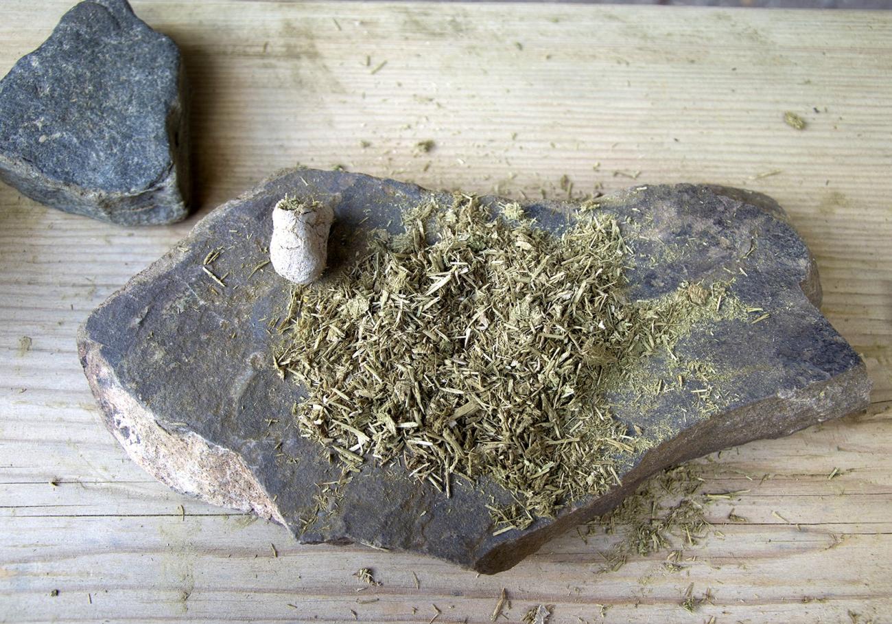 The tempers were prepared by one person and took approximately one hour to complete. The sand was added without being sieved or ground, whereas the calcite and the organics were ground by using two gneiss stones (See Figure 3a). At the time of preparation, the organics were completely dry. The grinding was coarsely done purposely , taking care to leave some fibres intact in order to obtain a heterogeneous fibre-sizes mix, ranging from < 1 to 3 mm (goat and cattle dung) up to 10 mm (donkey and horse dung). It is worth noting that not only the size but also the morphology and the width of the fibres varied depending on the type of dung. The goat dung also contained seeds.