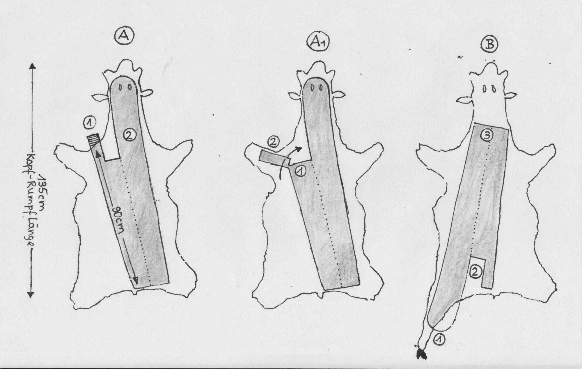 Variant A (See Figure 11) seems the most plausible. However, an above-average sized hide is needed. The slightly skewed placement of the pattern seems necessary to maximize length utilization. The course of the hair would essentially be oriented downward from the opening and to the side. During the practical use of the quiver, this could facilitate the drainage of rainwater and thus improve the protection of the quiver's contents from moisture. On the other hand, in the case of the longitudinal closing flap, which is formed by the skin of the neck, the hair would run in the direction of the mouth, which tends to cause a build-up of moisture in this area during rain. If one assumes that the longitudinal flap, which is not completely preserved in the original, reached to the strap below the muzzle to be knotted there, the deer must have been skinned along the entire neck and up to the head to achieve the necessary length.